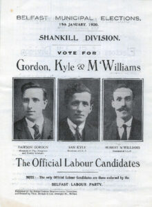 En el moment de les eleccions municipals de 1920, els laboristes de Belfast aconseguien dotze escons i igualaven la seva quota mitjana de vots de les eleccions generals de 1918, fins i tot aconseguint el vint per cent al veïnat predominantment catòlic de Falls. [lxxxi] Aparentment, existia un electorat antisectari, l’aparició del qual reflectia l’augment massiu de l’activisme sindical. Henry Patterson argumenta que el vot del Belfast Labour Party només representava “la política municipal amb venjança” i que “la minoria de treballadors protestants que van votar pels candidats laboristes no havien revolucionat la seva política”. [lxxxii] Malgrat això, els seus oponents lleialistes s’havien passat un any retratant-los com una cinquena columna republicana. [lxxxiii] Aquesta vegada, James Turkington, de la UULA, es va enfrontar al socialista Sam Kyle al veïnat de Shankill i el seu discurs va deixar al seu públic ben informat sobre les intencions laboristes: