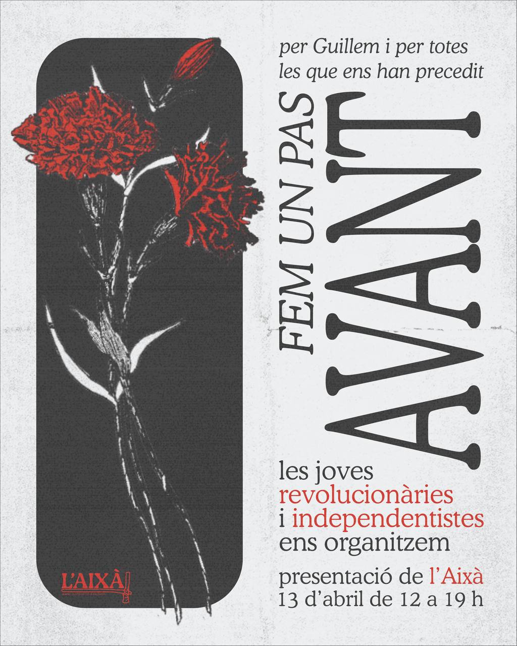 Fa anys que les joves independentistes, socialistes i feministes no tenim un espai on organitzar-nos a la ciutat de València i és per açò que naix L’Aixà, L’Assemblea de Joves de l’Esquerra Independentista a la ciutat de València, amb la voluntat d’esdevindre una eina per a les joves de classe treballadora d’aquesta ciutat i que alhora servisca d’exemple per a articular un moviment juvenil arrelat i amb força arreu del País Valencià, entenent-nos sempre Països Catalans. Diumenge 13 d’abril ens podreu trobar al CSOA L’Horta, on farem la presentació de l’assemblea, emmarcada dins un cap de setmana ple de lluita i organització, començant per la diada de Guillem Agulló. Per ell i per totes les que ens han precedit, les joves revolucionàries i independentistes fem un pas avant i ens organitzem.