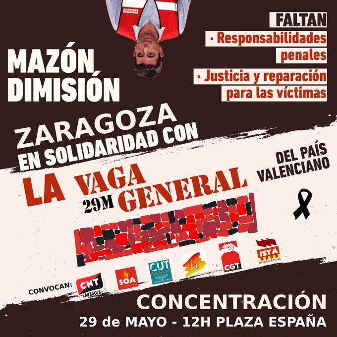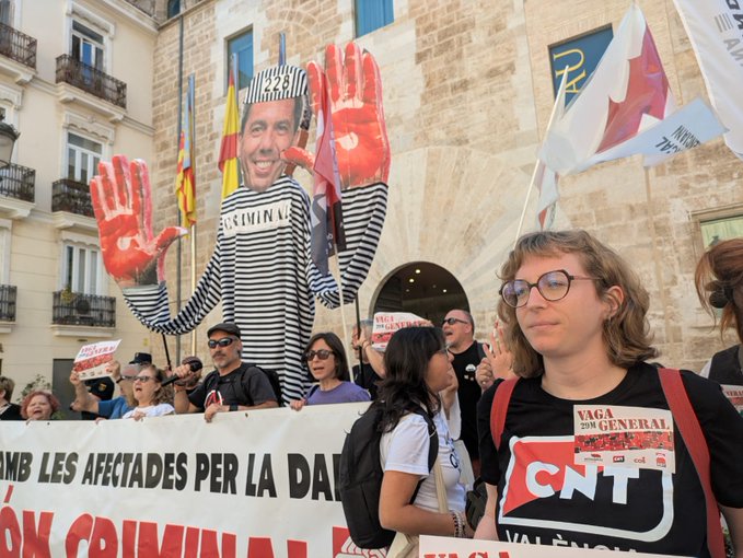 Els sindicats que formalment han impulsat la convocatòria de la Vaga General són la COS, la CGT, la Intersindical i la CNT, és a dir, els sindicats no assimilats al sistema. En el comunicat conjunt que han tret per a convocar a la Vaga, apunten molt més enllà de Mazón: «Que siga el màxim responsable no vol dir que siga l’únic responsable. Part de l’empresariat va amagar a la seua plantilla el que estava succeint, privant-la de mirar el mòbil perquè no abandonaren el seu lloc de treball o coaccionant-la perquè hi acudiren, a pesar de les condicions meteorològiques adverses en algunes comarques i els avisos de risc molt greu en altres. Açò ha ocasionat un perill real i tangible contra la vida i la salut de les treballadores i treballadors, que, en alguns casos, ha tingut un final fatal i, en molts altres, ha comportat seqüeles psicològiques».