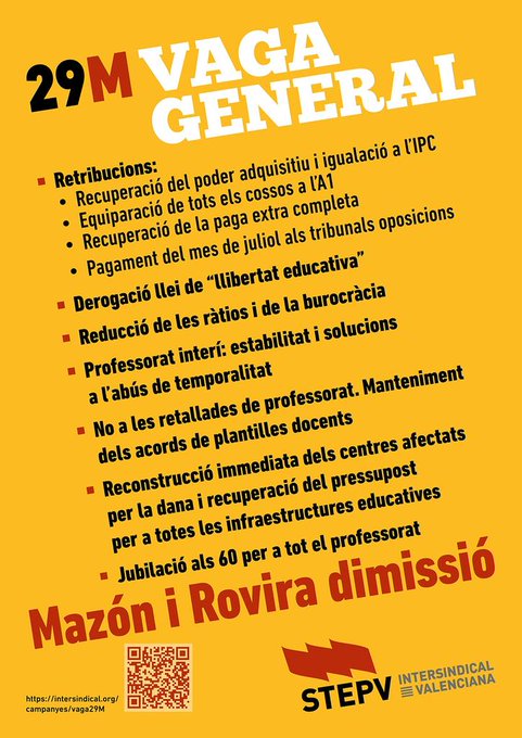 Com asseguren els sindicats convocants «la reconstrucció s’ha de fer amb un altre paradigma perquè no ens torne a passar el mateix. El negacionisme de Vox ha trobat un portaveu en Carlos Mazón, que ja no sap què fer per aferrar-se a la poltrona. Per tot això, continuem exigint la dimissió de Carlos Mazón amb la consegüent caiguda de tot el seu Consell. Que això succeïsca és el primer pas necessari per a la reparació de les víctimes». De fet, la Vaga General és també un canvi de paradigma en la lluita de les classes treballadores, que necessiten desfer-se del jou dels sindicats majoritaris per a poder tornar a enfrontar-se a unes classes dominats cada cop més irrespectuoses amb la vida i més embravides en les retallades de drets.