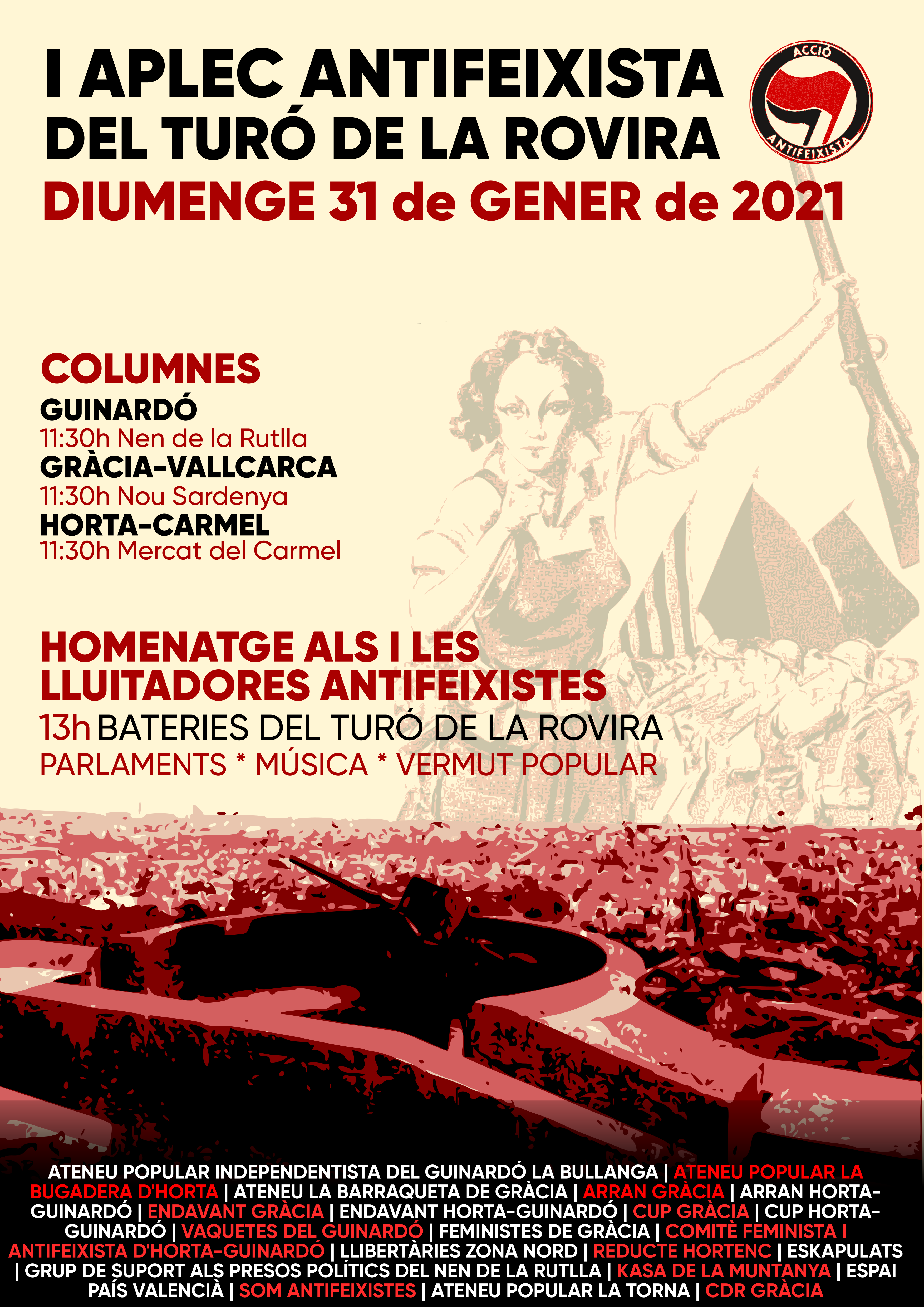 Per tot això hem convocat aquest diumenge 31 de gener al I Aplec Antifeixista del Turó de la Rovira, on hi hagué les bateries antiaèries que intentaren combatre els bombardejos feixistes a la ciutat.