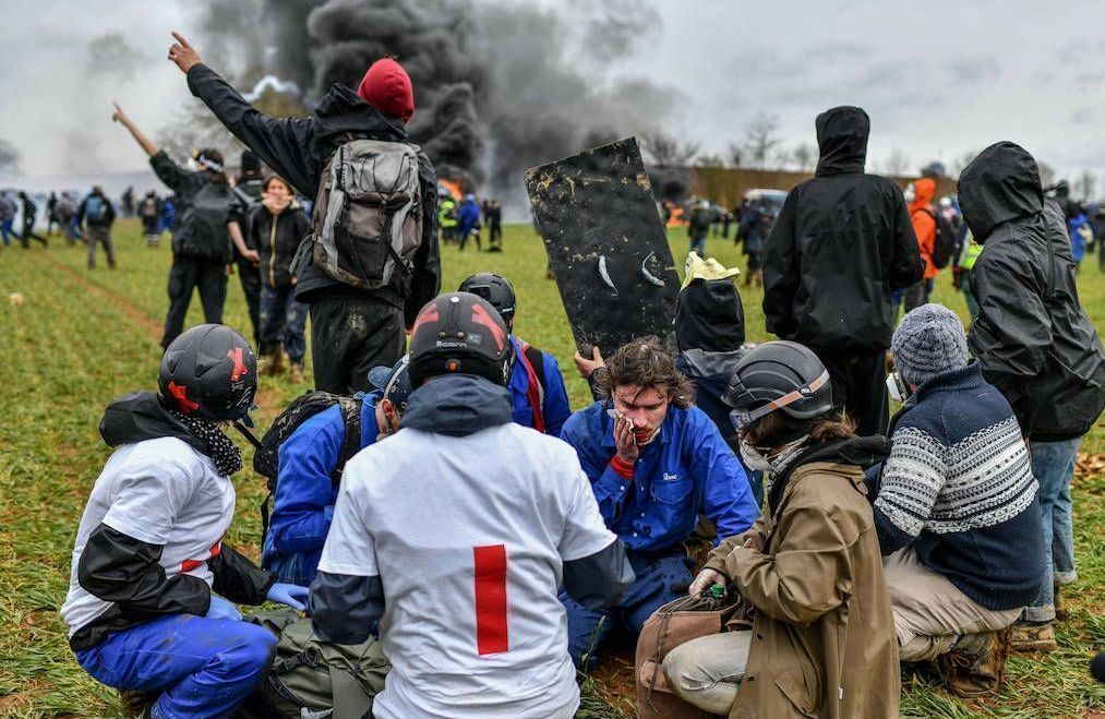 Així doncs, les forces de l’ordre es van desfermar immediatament tan bon punt van arribar els manifestants, quan unes columnes es trobaven en un mode d’actuació de tipus cadena humana al voltant de la conca, mentre que d’altres intentaven de manera més dinàmica i ofensiva entrar a l’obra. Una pluja de granades va caure sobre totes les columnes. Es van disparar ni més ni menys que 5.000 granades en dues hores, no només gasos lacrimògens sinó també granades d’atordiment, acompanyades de trets de LBD[5]. L’objectiu del govern era sotmetre la creixent disputa per les pensions i netejar l’afront que representava l’acció dels SLT i el moviment ecologista, i les humiliacions que havia patit la policia durant les manifestacions anteriors. L’objectiu era espantar el moviment, en carn pròpia, encara que signifiqués mutilar, obstruir l’arribada d’ajuda, córrer el risc de matar. Això és el que vam presenciar durant les dues hores d’enfrontaments. En la nostra història política, mai havíem vist tants ferits en tan poc temps.