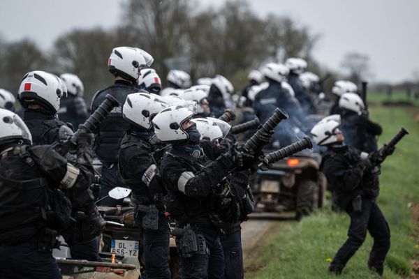 Malgrat els bloquejos dels combois de manifestants i els controls policials, 30.000 persones van sortir del campament. Ho subratllem perquè és absolutament inèdit en la història d’aquesta lluita per l’aigua i segueix sent, entre tota una sèrie d’accions potents, un element significatiu del cap de setmana. En el camí, ens adonem que el desplegament policial ha canviat respecte a èpoques anteriors. Ara, 3.000 policies i gendarmes es concentren purament i senzillament a la conca, en un dispositiu que es pot jutjar com a absolutament criminogènic. Els gendarmes estan recolzats contra un mur, concretament el dic que envolta la bassa, i es preparen per reprimir persones que el govern els ha presentat com a extremadament violentes. Tal com explicava molt bé l’informe de la Lliga dels Drets Humans, les instruccions de les autoritats eren molt clares: evitar que els manifestants arribessin a les reixes i a les obres, sigui quin sigui el cost humà.[4]