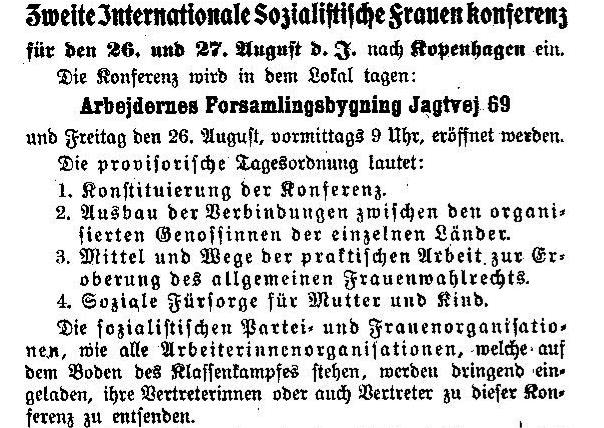 Així doncs, la demanda d’un sufragi universal sense distinció de sexe va ser inclosa al Programa del SPD Alemany el 1891, i també es van aprovar resolucions en favor del sufragi femení a la Conferència de Dones Socialistes de Mannheim (1906) i a la II Conferència Internacional de Dones Socialistes (1910), on també es va aprovar la resolució per instaurar un Dia Internacional de la Dona Treballadora. Alhora, també van ser incloses altres demandes com va ser la legislació protectora pel treball femení, una de les reivindicacions que havia estat negada per les feministes burgeses ja que reduïa les condicions d’explotació de les dones obreres.