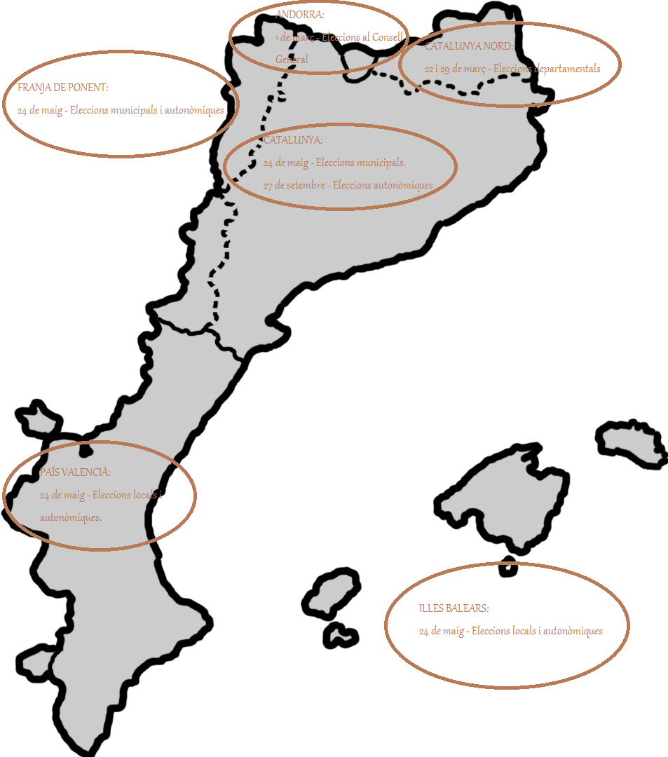 La primavera serà temps de sotragades polítiques al sud de l’Albera. Catalunya, País Valencià, Illes Balears i la Franja, celebraran eleccions municipals, mentre que, les tres darreres viuran també eleccions autonòmiques. En l’àmbit municipal s’espera una irrupció de les “Crides” i altres candidatures populars i rupturistes impulsades per la Candidatura d’Unitat Popular i altres sectors anticapitalistes. Està per veure també, quin és el nombre real de candidatures de Guanyem que s’impulsaran arreu del país, així com la seua implantació més enllà de Barcelona. A nivell autonòmic està per veure si, com totes les enquestes indiquen, una nova majoria plural foragitarà el Partit Popular dels governs autonòmics del País Valencià, Aragó i les Illes Balears. A hores d’ara el PP domina la majoria de les intitucions autonòmiques i municipals dels Països Catalans, en alguns casos -com el valencià- des de fa dècades. Cal afegir també, que aquestes eleccions regionals seran la primera prova de foc per a la mediàtica formació Podemos, que espera molt bons resultats i condicionar els canvis de govern autonòmics.