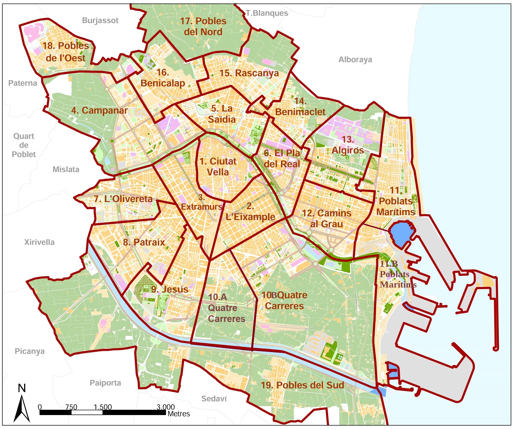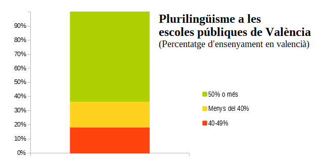 Per districtes escolars, la situació és molt diversa. Actualment, les escoles públiques amb més d’un 50% d’ensenyament en valencià són majoritàries a Ciutat Vella, Extramurs, Campanar, Saïdia, Patraix, Jesús, Cabanyal-Malva-rosa, Camins al Grau, Algirós, Benimaclet, Benicalap i Pobles del Sud. En canvi, la presència del valencià a l’escola pública és minoritària a l’Olivereta, el Grau-Natzaret, Rascanya, i molt especialment, a l’acomodat Pla del Real, on no existeix cap centre que arribe al 49% de l’ensenyament en valencià.