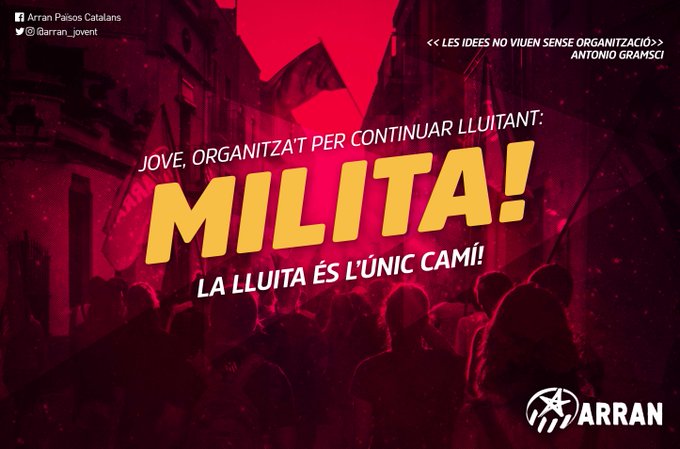 Per això, tu que saps que tenim la necessitat imperiosa de guanyar per no morir; tu que saps que és insostenible que la nostra ràbia no es converteixi JA en una organització forta i amb una estratègia al darrere que ens prepare per guanyar, ja saps el que has de fer. Organitza’t. Milita. Milita en Arran, si vols. I si Arran no t’agrada, milita en algun altre espai per les joves treballadores. Però organitza’t, comparteix els teus coneixements, aprèn de les companyes, aporta la teua força al col·lectiu. Renuncia a l’individualisme: la història no es canvia des dels individus, sinó des de la força conjunta.
