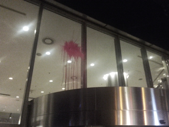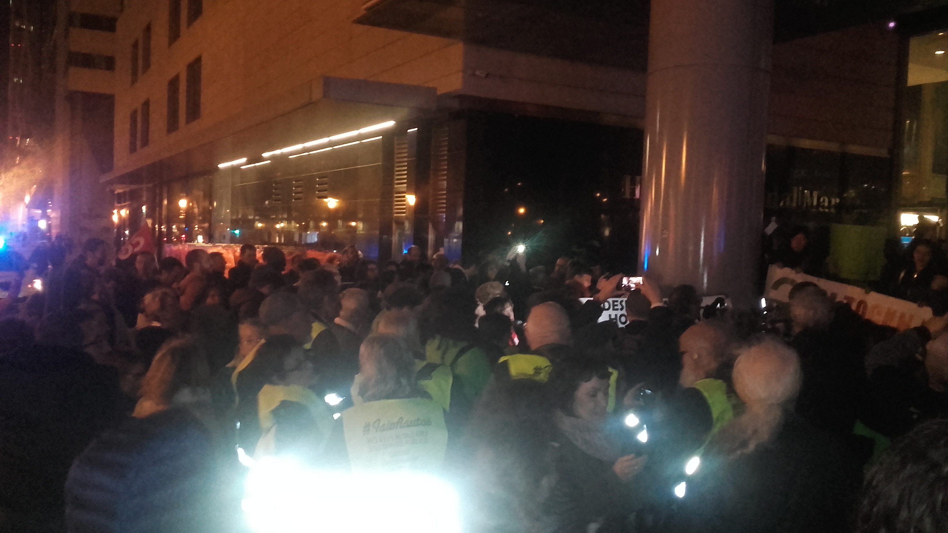 Faltaven encara cinc minuts per l’hora en què estava convocada la mobilització, les 19.30h, i ja hi havia desenes de persones a la vorera d’enfront del Hilton. Ha estat aleshores quan la concentració ha creuat fins a l’entrada del vestíbul. Des d’aleshores i fins que s’ha desconvocat, vora les 20.30h, la concentració no ha callat ni un sol moment: “No a l’externalització, les Kelly’s en plantilla!”, “Visca, visca, visca la lluita feminista!”, “Si ens toquen a una, ens toquen a totes”, “Readmissió companyes acomiadades!” han estat els crits més cantats. Quan la gent cridava “Així, així, així, ni un pas enrere, contra el Hilton, acció directa!”, un parell d’ous de pintura han esclatat als vidres del vestíbul.