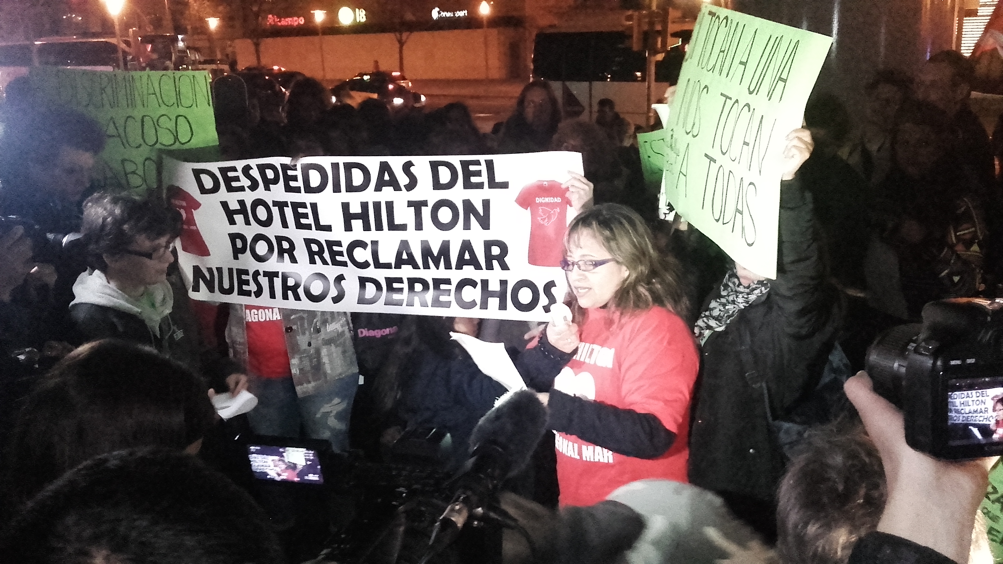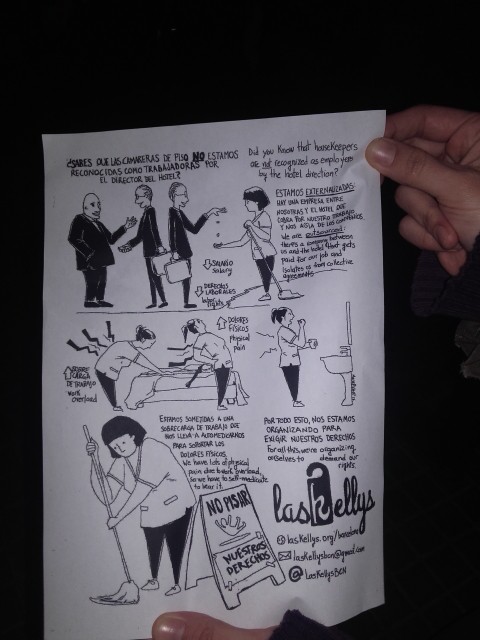 Una membre de les Kelly’s ha estat l’encarregada de llegir el manifest amb les reivindicacions que motivaven la mobilització. Han demandat el Hilton per cessió il·legal en tenir les cambreres de pis contractades a través d’una empresa externa. És aquesta externalització el que volen revertir i ha estat la denúncia per fer-ho el que n’ha suposat l’acomiadament. El manifest és un repàs de les precàries condicions en què treballen. Dues d’elles són treballadores sensibles: tenen limitacions físiques per la sobrecàrrega de treball. Moltes d’elles van medicades a treballar; i a més ara els encarreguen les tasques més complicades, com a càstig encobert per haver reclamat els seus drets.