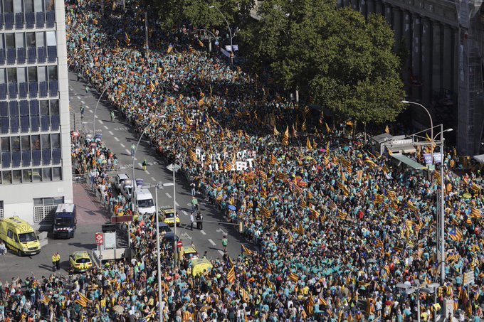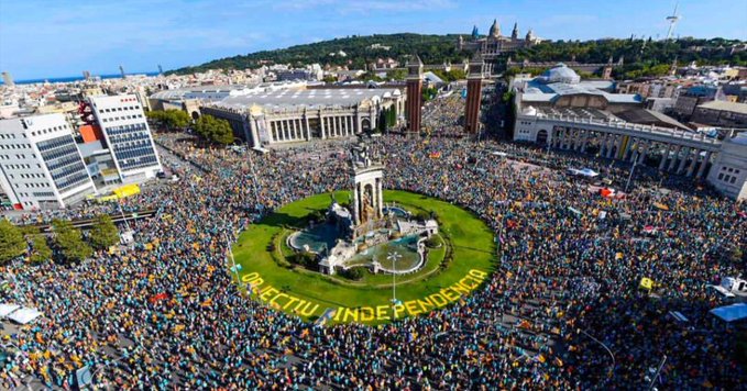 La manifestació convocada a Barcelona per l’Assemblea Nacional Catalana amb el lema ‘Objectiu Independència’ aplegà 600.000 manifestants, en un recorregut des del passeig de Gràcia fins a la Plaça Espanya, segons les xifres ofertes per la Guàrdia Urbana. A la mobilització de l’ANC, compartida amb Òmnium cultural i l’AMI, els partits tingueren menys protagonisme, en una escenificació que buscava evitar centrar-se en la reacció a la sentència del judici polític de Madrid, així com deixar en un segon pla les discrepàncies tàctiques entre ERC i el PDEcat, enfrontats en una disputa per qui ocupa la major referencialitat del nacionalisme.