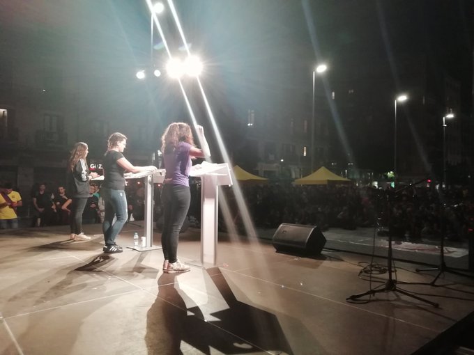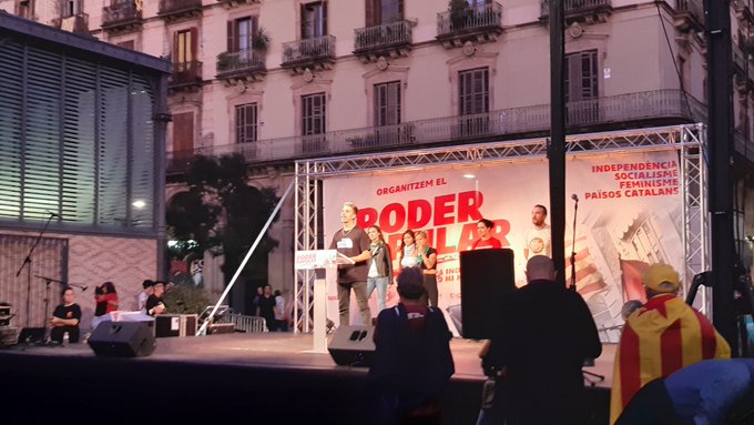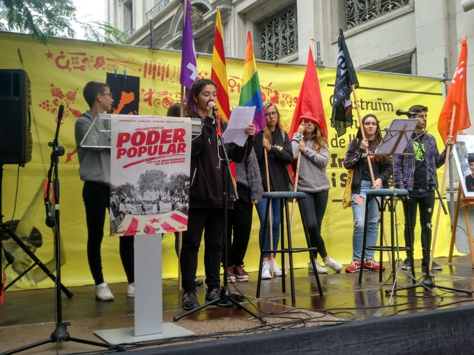 Des de les lluites del Pirineu un representant denuncià la depredació del territori als Països Catalans, amb exempels com els projecte de Jocs Olímpics d’hivern, i la crisi ambiental i climàtica al món, conlogué”defensar la vida vol dir combatre el capitalisme”; un membre del Sinsicat d’Habitatge del Raval explicà la seva lluita, “hem pres la determinació de passar per damunt dels especuladors, fer-los fora del barri, per tots els mitjans”, destacà, defensà la construcció nacional apel·lant a “construir un moviment popular per què el proper 1O sigui una insurreció popular”; una militant del sindicat COS explicà la lluita per defensar l’ensenyament públic “cal treballar per construir el poder popular als llocs de treball”; representants de la taula pel dret a l’avortament i el moviment feminista feren una crida a la lluita pels drets de totes les dones, incloses les migrants. Un parlament d’Anna Gabriel, refugiada a Ginebra, es dirgí també als assistents. Per acabar l’acte portaveus de l’esquerra independentista feren una crida a construir el ‘Poder popular’ i a la ‘desobediència’, a més d’algunes crítiques al govern autonòmic “És també la renúncia a la desobediència del govern la que ens ha dut on som. Perquè ens volen vençudes, nosaltres som resistents i lluitadores. La sobirania per nosaltres té un nom i es diu socialisme. Sigui quina sigui la sentència, cal trencar el tauler de negociació”. “Tenim el deure però sobretot l’oportunitat i l’esperança de canviar la història. La lluita és l’únic camí!”, conclogueren.