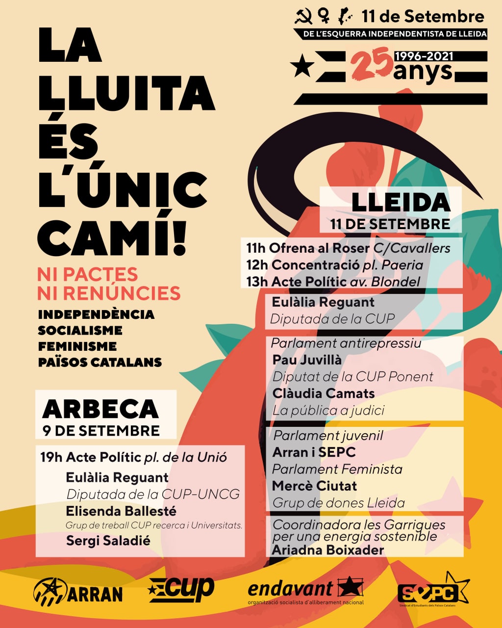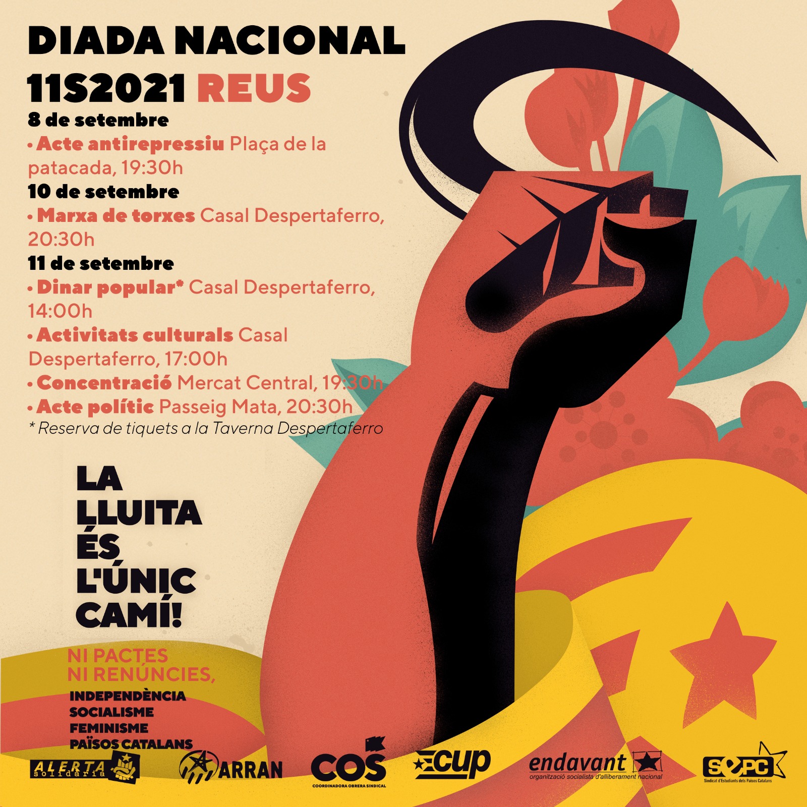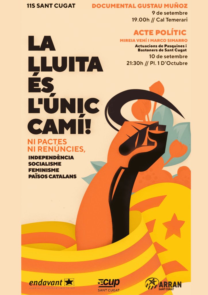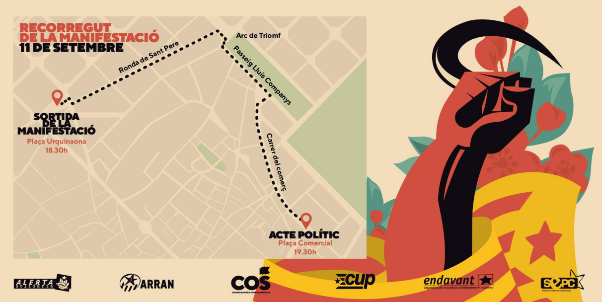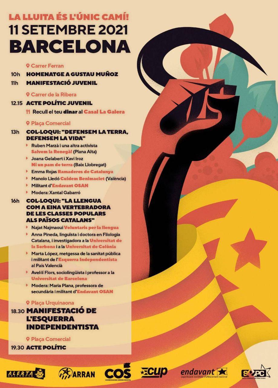 Als actes d’aquest any, les organitzacions que conformen l’esquerra independentista (Arran, la COS, la CUP, Endavant OSAN, el SEPC i Alerta Solidària) convoquen amb el lema “La lluita és l’únic camí: Ni pactes ni renúncies” i reclamen sense embuts els seus objectius polítics: “Independència, socialisme, feminisme, Països Catalans”.
