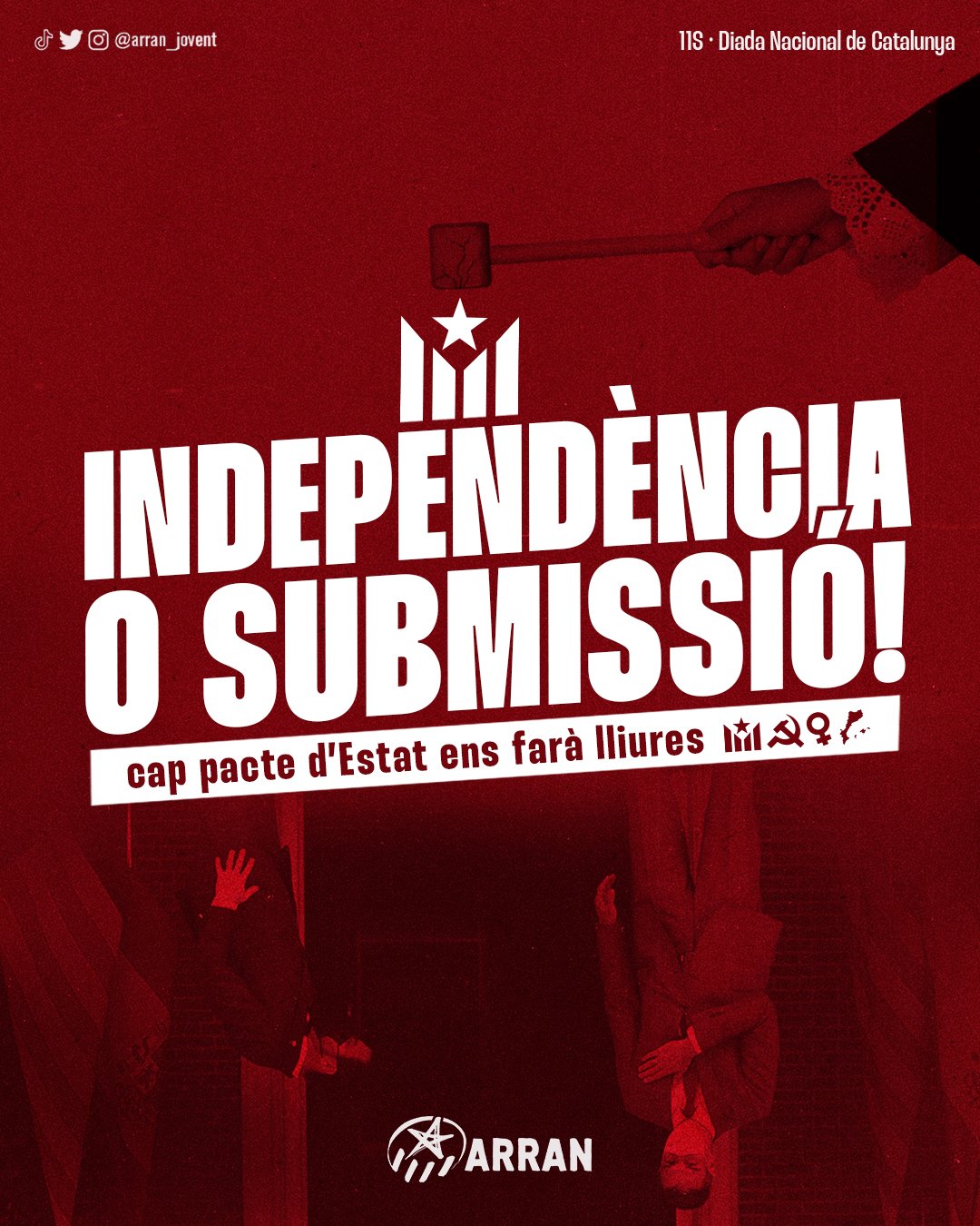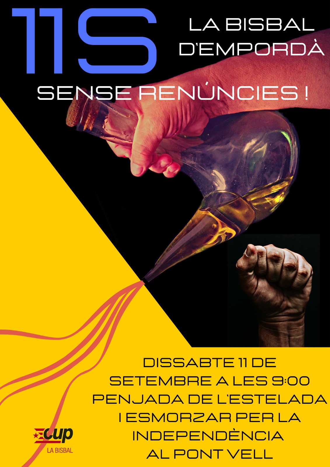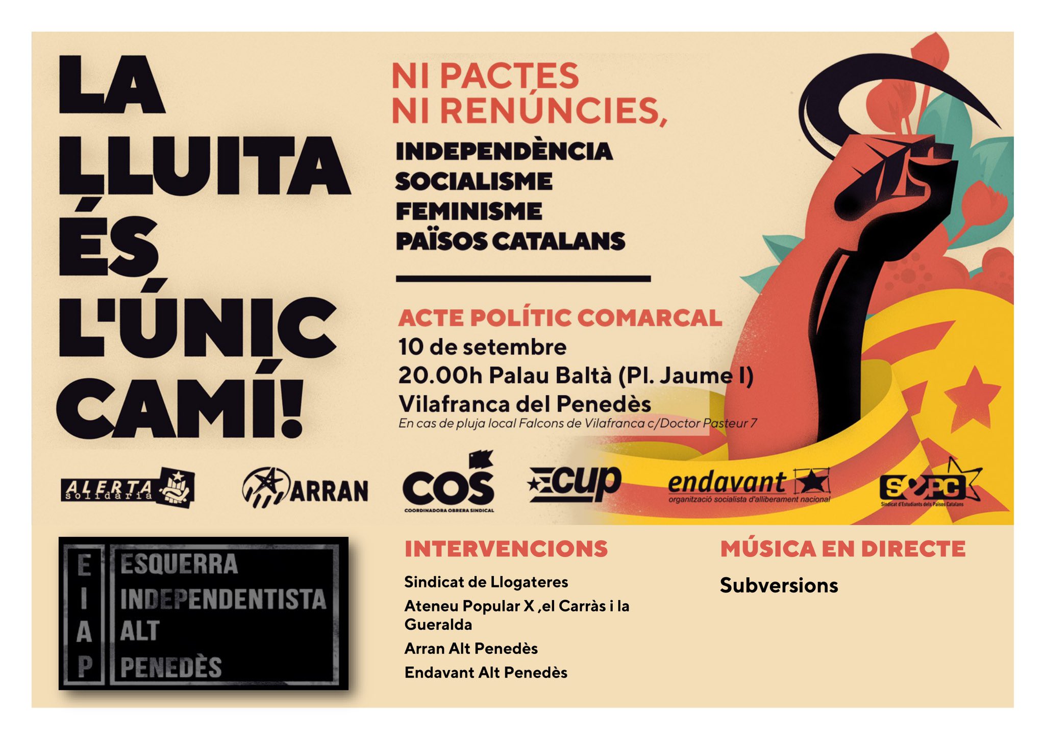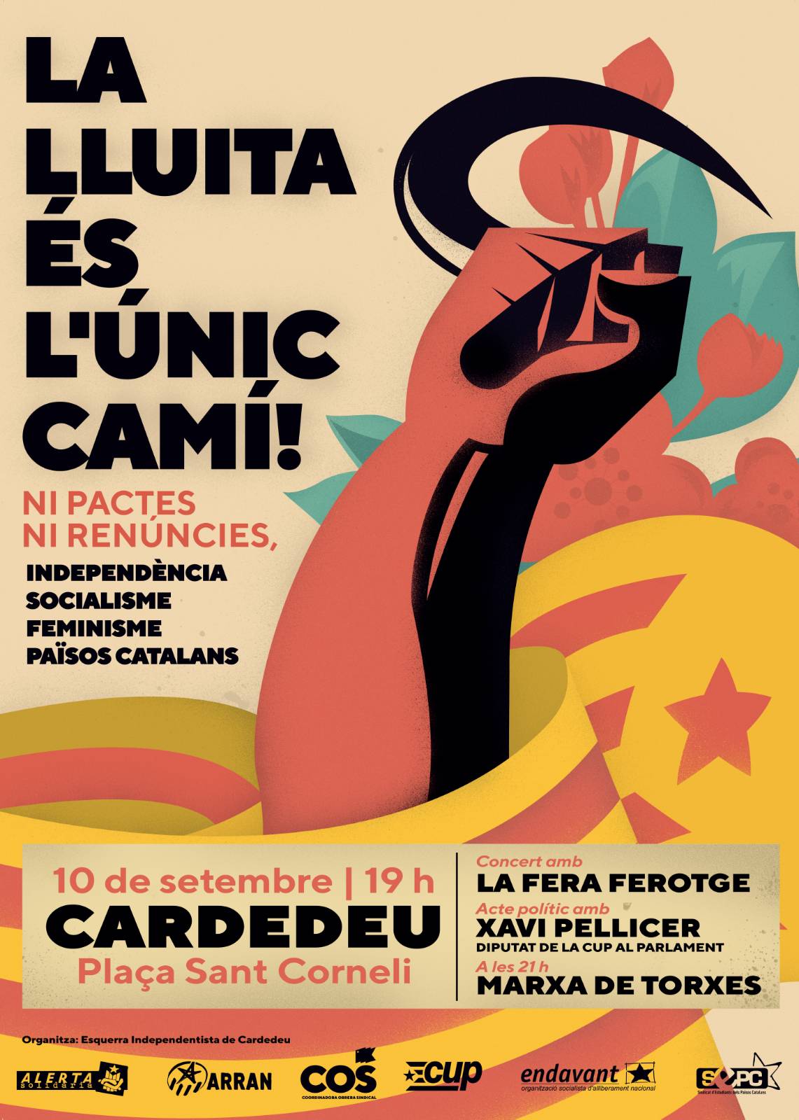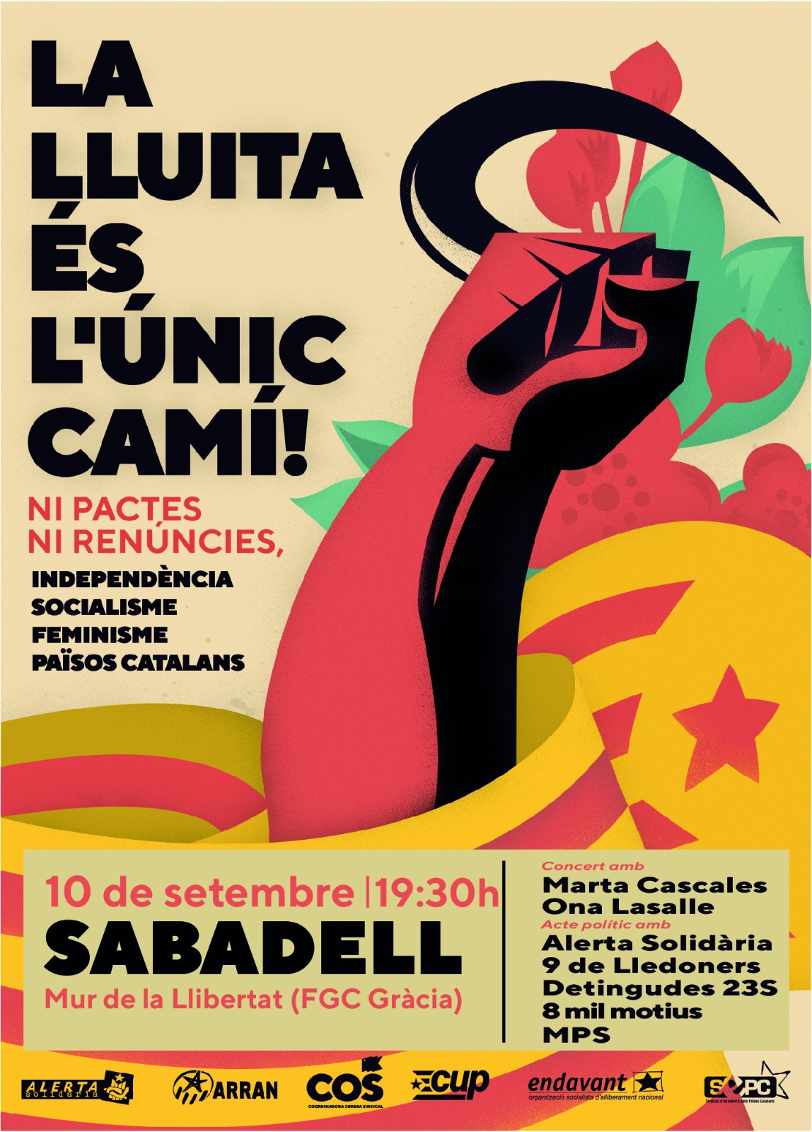 Als actes d’aquest any, les organitzacions que conformen l’esquerra independentista (Arran, la COS, la CUP, Endavant OSAN, el SEPC i Alerta Solidària) convoquen amb el lema “La lluita és l’únic camí: Ni pactes ni renúncies” i reclamen sense embuts els seus objectius polítics: “Independència, socialisme, feminisme, Països Catalans”.
