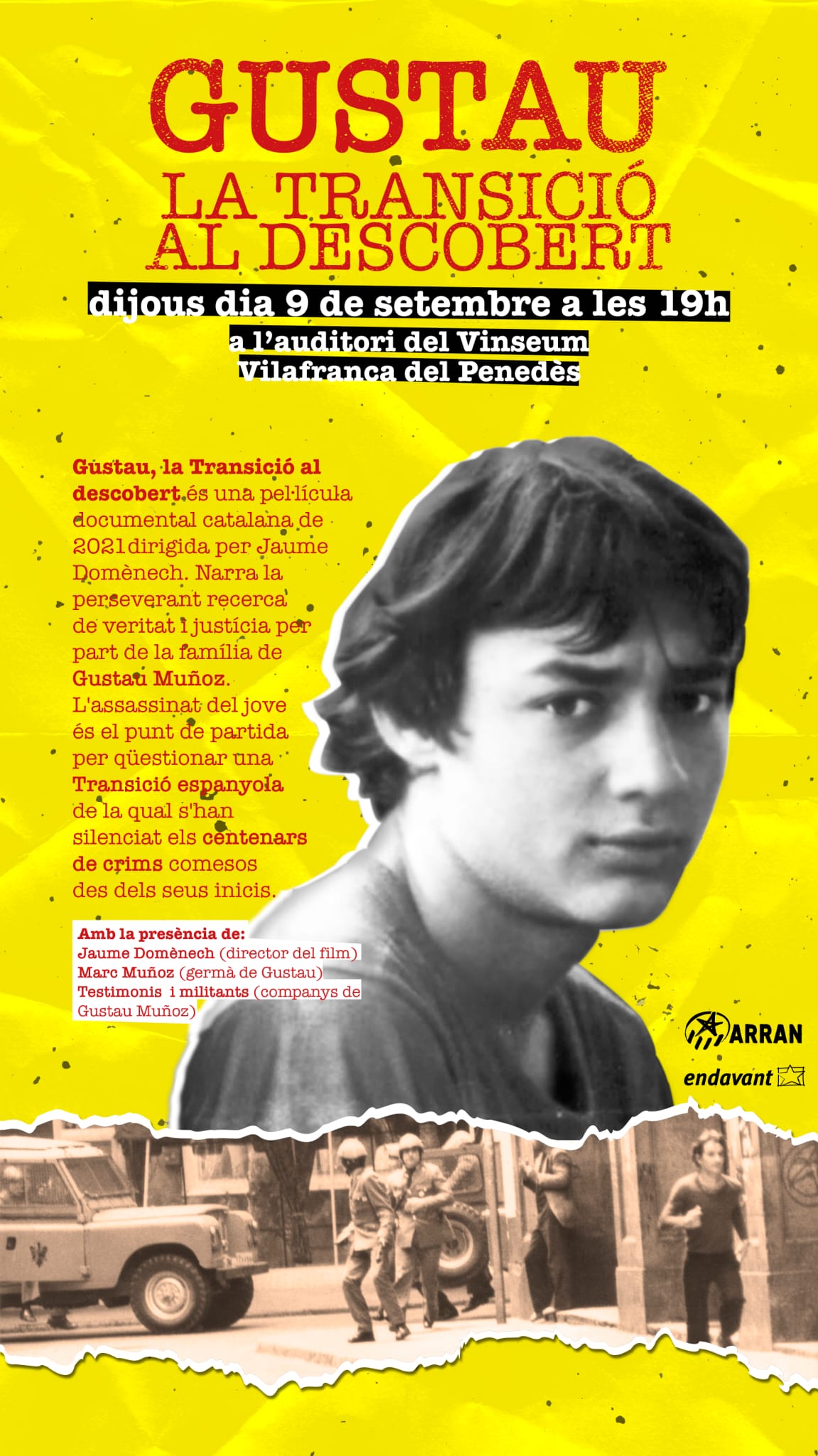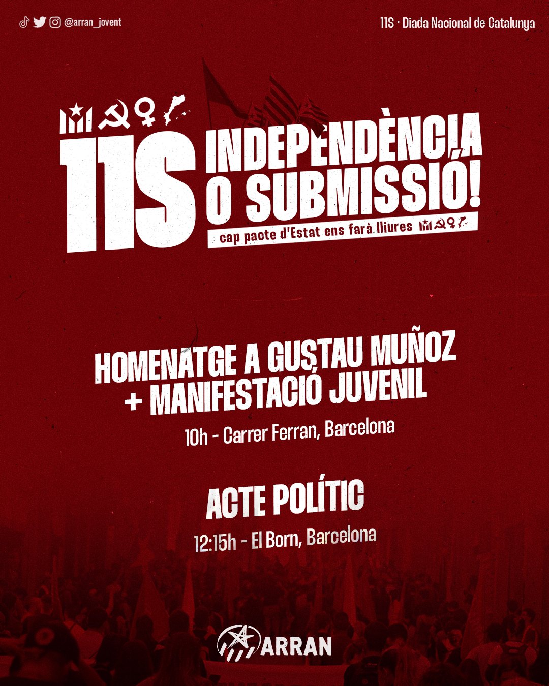 Al matí l’organització juvenil de l’esquerra independentista, Arran, serà la protagonista, amb l’homenatge que realitza cada any a Gustau Muñoz, jove independentista assassinat per la policia espanyola l’any 1978, serà al carrer Ferran a les 10h. Després realitzarà la manifestació i juvenil del matí, a les 11h carrer de la Ribera. que acabarà al Born amb un acte a les 12:15. Durant el dia el conjunt de les organitzacions, a més de l’habitual presència al Fossar de les Moreres, faran diversos actes al Born, a l’espai de a plaça comercial. Es podrà dinar al Casal La Galera.