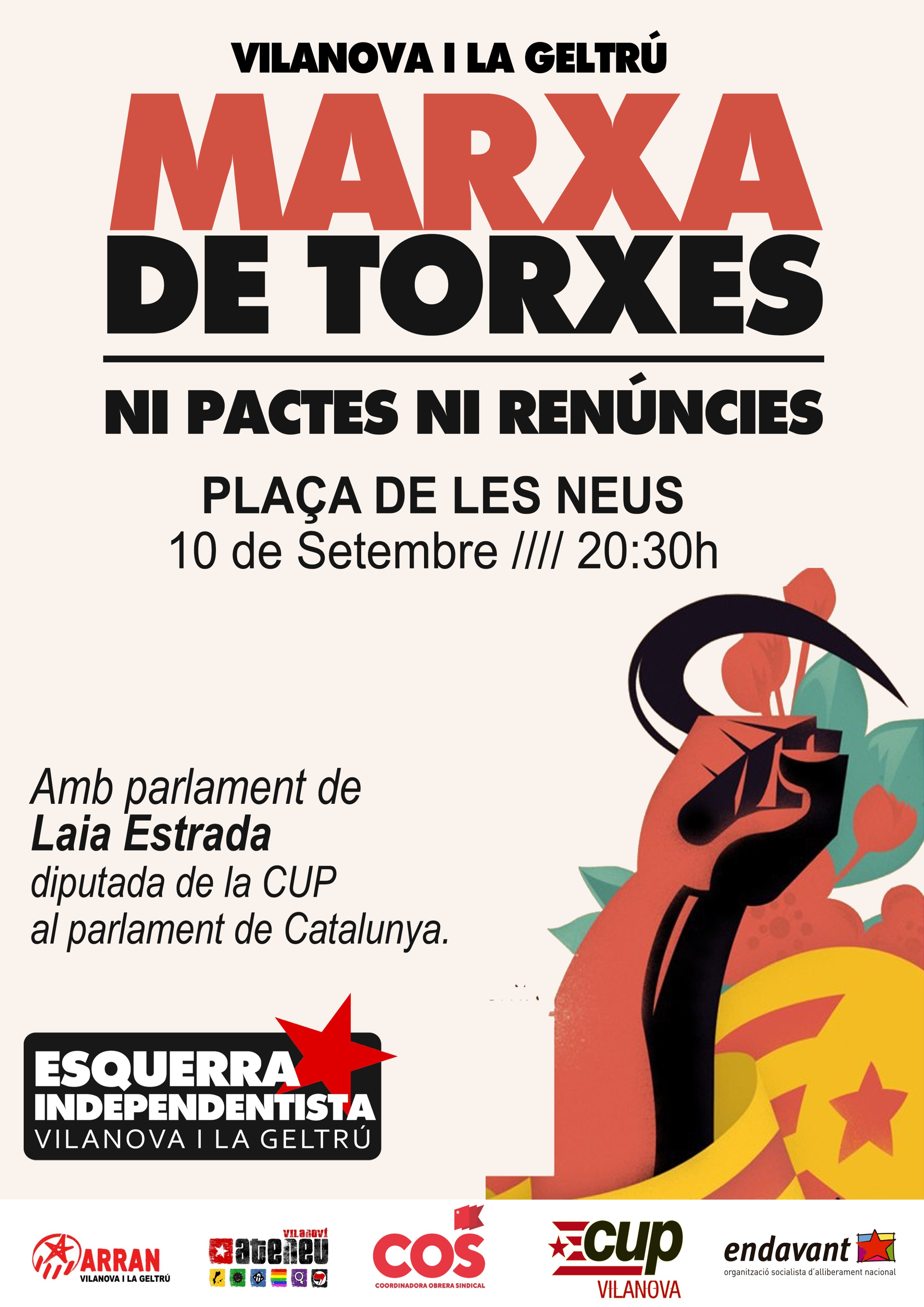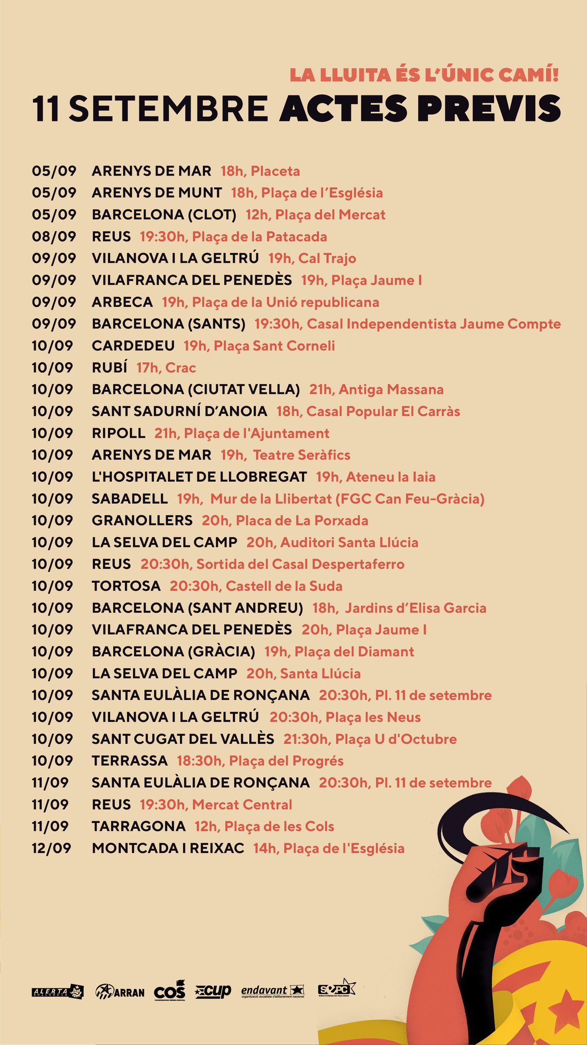 Cardedeu 19h pça Sant Corneli / Rubí, 17h, Crac / Ciutat Vella (BCN) 21h, Antiga Massana / Sant Sadurní d’Anoia, 18h, Casal Popular el Carràs / Ripoll, 21h, pça de l’Ajuntament / Arenys de Mar 19h, Teatre Seràfics / L’Hospitalet de Llobregat, 19h, Ateneu la Iaia / Sabadell, 18h, Mur de la Llibertat FGC Can Feu / Granollers, 20h, pça de la Porxada / La Selva del Camp, 10h, auditori Santa Llúcia / Reus, 20:30h, sortida Casal Despertaferro / Tortosa, 20:30h, Castell de la Suda / Sant Andreu (BCN), 18h, Jardins Elisa Garcia / Vilafranca del Penedès, 20h, pça Jaume I / Gràcia (BCN), 19h, pça del Diamant / Santa Eulàlia de Ronçana, 20:30h, pça Onze de Setembre / Vilanova i la Geltrú, 20:30h, pça de les Neus / Sant Cugat del Vallès, 21:30h, Plaça U d’Octubre / Terrassa, 18:30h, pça del Progrés .