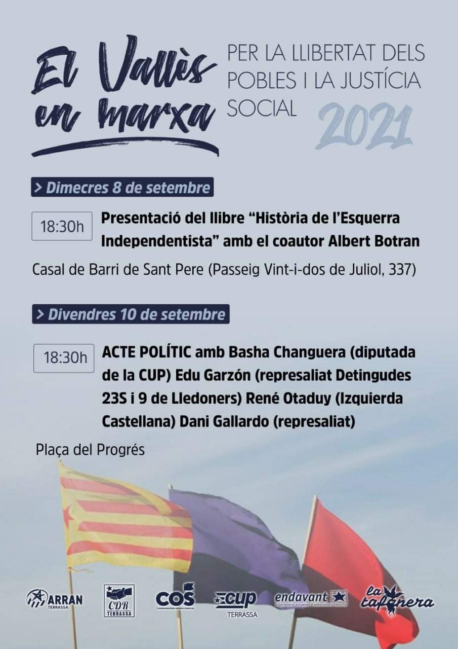 Vilanova i la Geltrú 19h Cal Trajo / Vilafranca del Penedès 19h, pça Jaume I / Arbeca, 19h pça Unió republicana / Sants (BCN) 19:30h, Casal Independentista Jaume Compte .