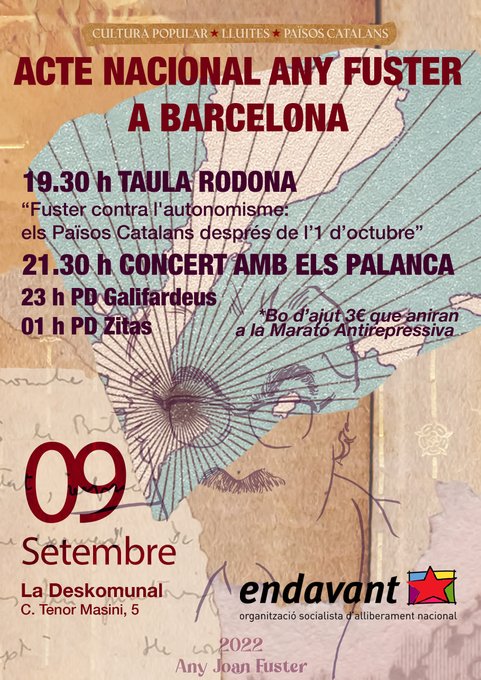 19:30h, a la Deskomunal. C. Tenor Masini, 5. Taula Rodona “Fuster contra l’autonomisme: els Països Catalans després de l’1 d’octubre”. 21:30h Concert amb Els Palanca. 23h PD Galifardeus i PD Zitas. Organitzat per Endavant.
