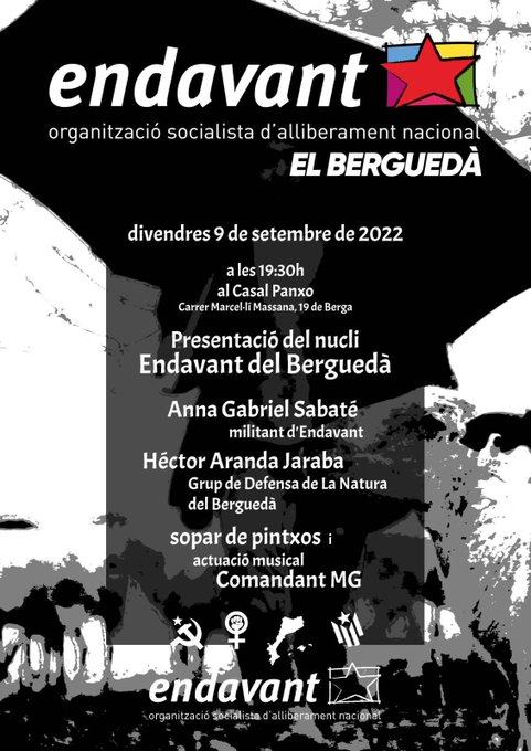 19:30h, Casal Panxo, c. Marcel·lí Massana 19, Berga. Acte amb Anna Gabriel, d’Endavant, i Héctor Aranda Jaraba, del Grup de Defensa de la Natura del Berguedà. Seguit de sopar i actuació musical amb Comandant MG. Organitzat per Endavant.