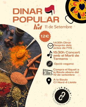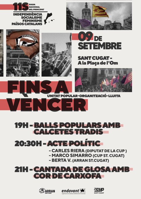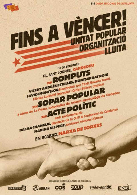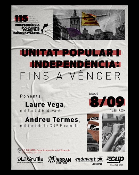 12h Carrer Muntadas. Acte polític, amb Martí Majoral (Alerta SolidàriaI i Ariadna Llena (Endavant), vermut i dinar popular, amb trivial dels Països Catalans. Organitzat per l’Esquerra Independentista.