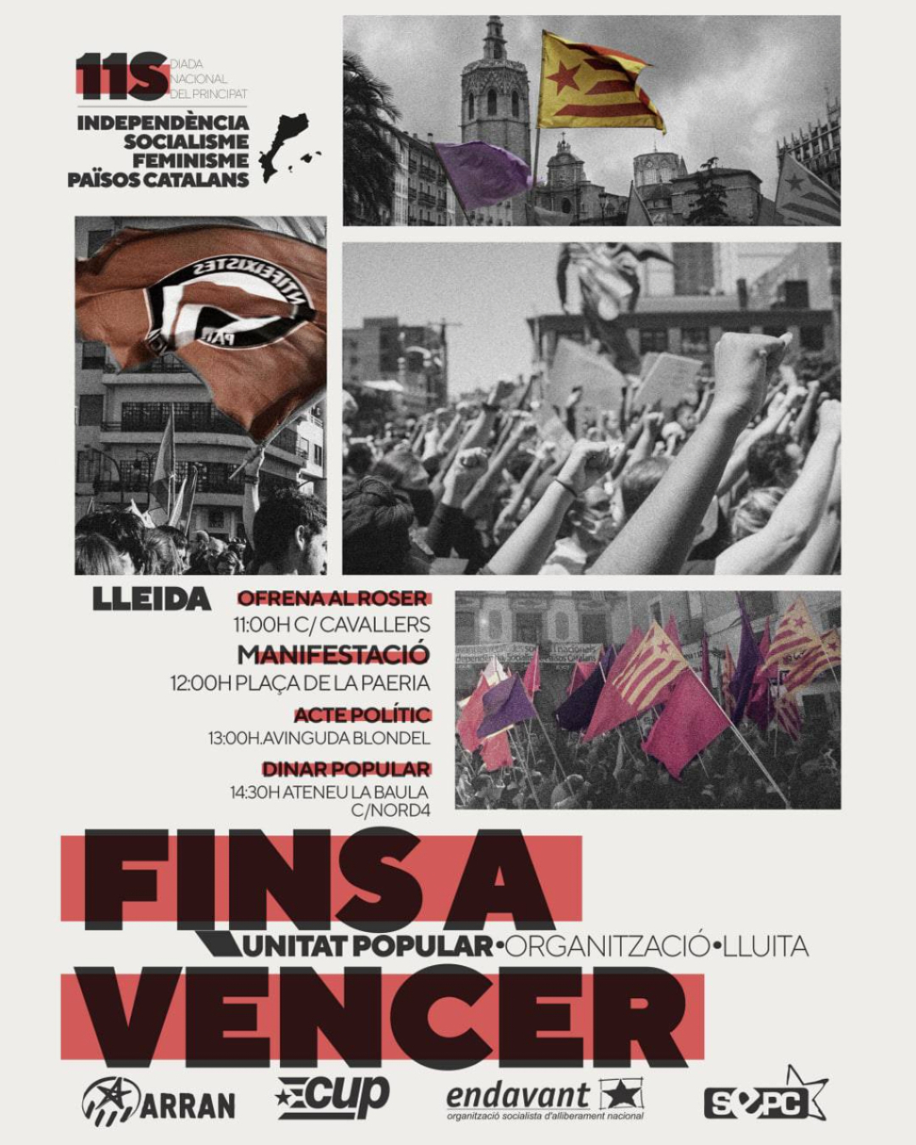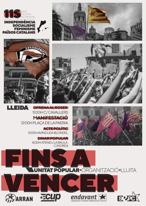 12h Manifestació. Plaça de la Paeria. 13h Acte polític a l’avinguda Blondel. I després Dinar popular i concert a La Baula. c. Nord, 4. Organitzat per l’Esquerra Independentista.