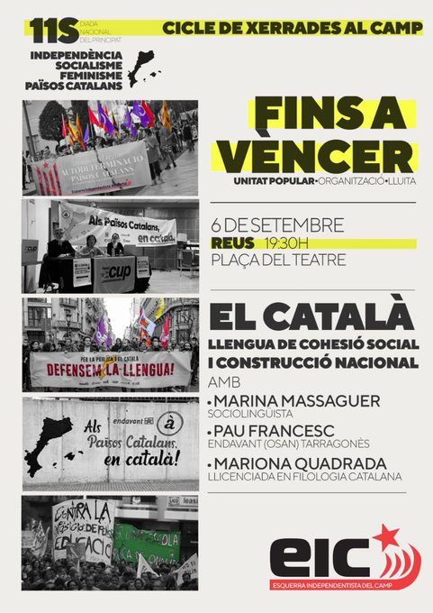 19.30 h, Pl. del Teatre, Reus. Amb Marina Massaguer (sociolingüista), Pau Francesc (Endavant (OSAN) Tarragonès) i Mariona Quadrada (filòloga). Organitzat per l’Esquerra Independentista.