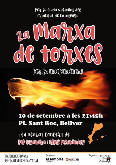 21:45h. Marxa de Torxes per la independència. A la Plaça Sant Roc de Bellver. I en acabat Concert amb Pep Lizandra i Elies Fernandez. Organitza Ateneu de La Cerdanya