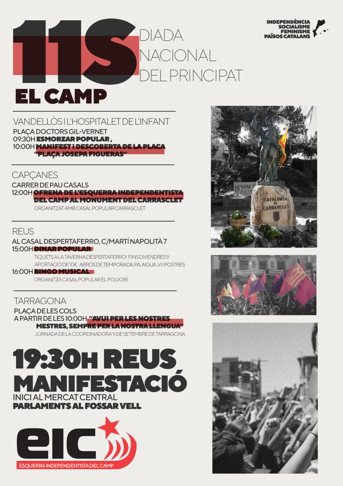 19.30h, Reus. Manifestació amb inici al Mercat Central i finalització al Fossar Vell (Peixateries Velles), on s’hi farà l’acte polític final (ca. 20.30h).