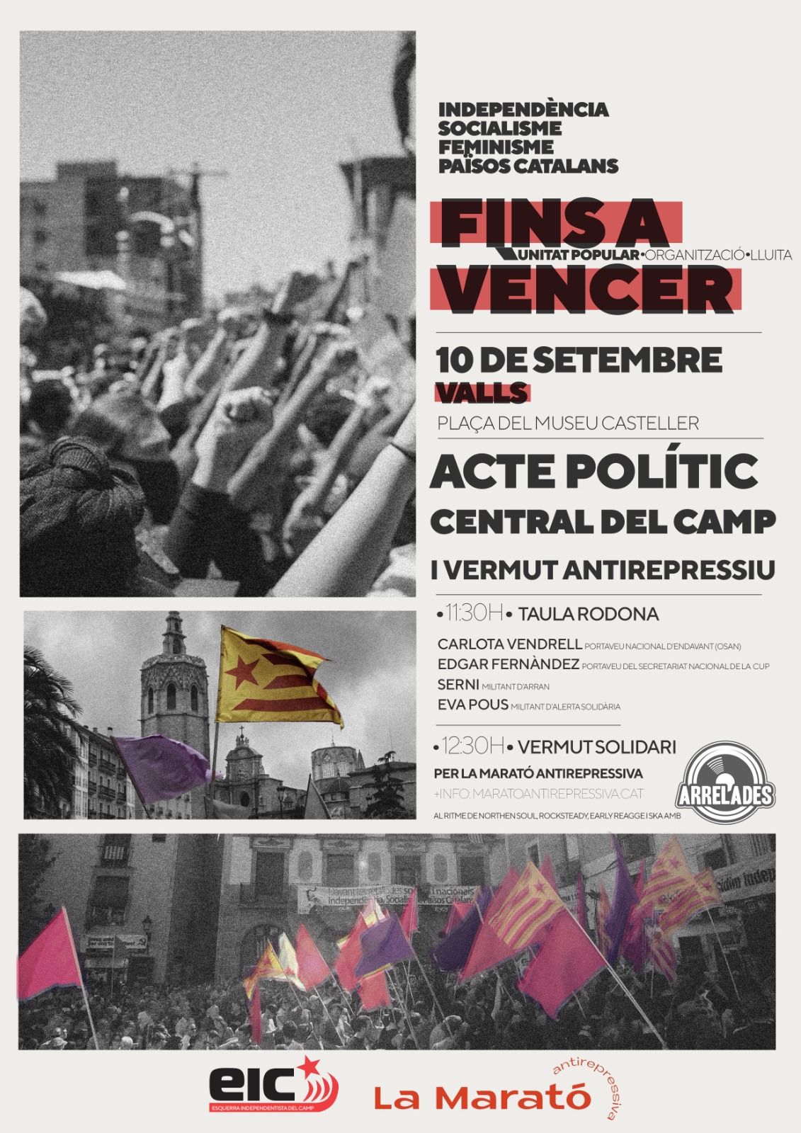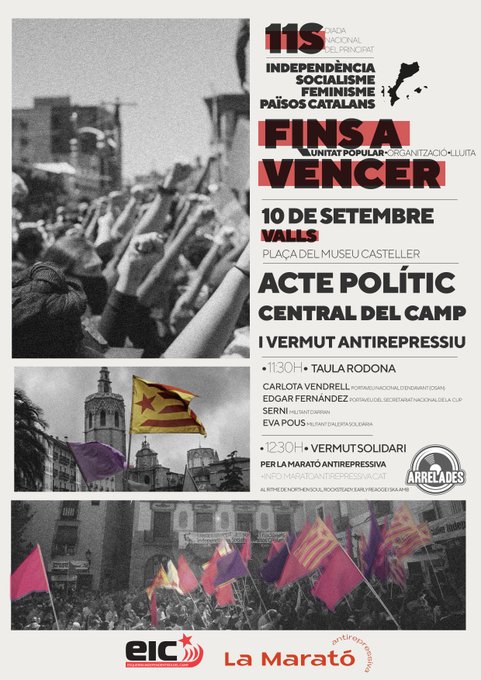 11.30 h, Pl. del Museu Casteller, Valls. Representants de diverses organitzacions de l’Esquerra Independentista (CUP, Arran, Endavant (OSAN) debatran en una taula rodona sobre el futur i el rol de l’Esquerra Independentista als Països Catalans. Tot seguit, hi haurà el I Vermut Antirepressiu, i tots els beneficis de la barra aniran destinats a la Marató Antirepressiva, una iniciativa que presentarà Eva Pous, advocada d’Alerta Solidària. Organitzat per l’Esquerra Independentista del Camp.