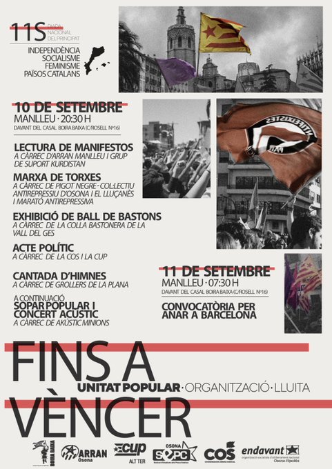 20:30h Davant el Casal Boira Baixa, carrer Rosell 16. Acte amb parlaments d’Arran manlleu i Grup de suport al Kurdistan. Marxa de Toxes, a càrrec del grup Pigot Negre, Col·lectiu antirepressiu d’Osona i el Lluçanès i Marató antirepressiva. Ball de Bastons amb la colla de la Vall del Ges. Acte polític amb intervencions de la COS i la CUP. A continuació sopar i actuació musical de Akústic Minions. Organitzat per l’Esquerra Independentista.