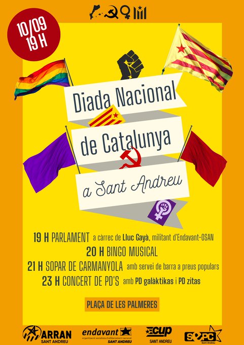 19h Plaça de les Palmeres acte polític de la Diada. 20h Bingo musical. 21h Sopar. 23h Concert: PD galaktikas i PD zikas. Organitzat per l’Esquerra Independentista.