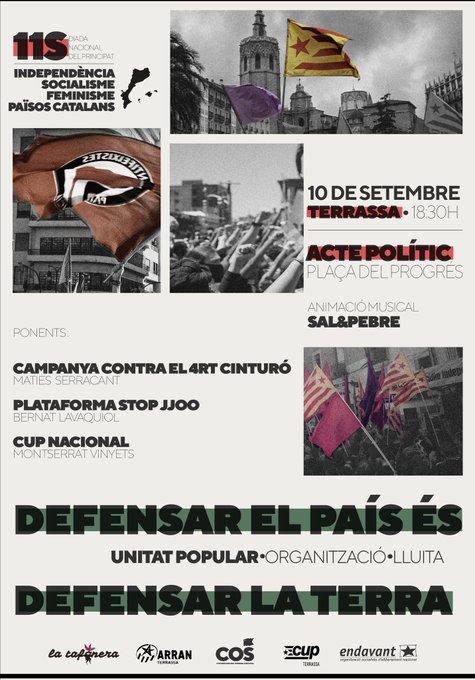 18:30h Plaça del Progrés. Acte polític amb participació de Maties Serracant de la Campanya Contra el 4t Cinturó, Bernat Lavaquil, de l aPlataforma Stop JJOO, i Montse Vinyets de la CUP. Animació musical amb Sal i Pebre. Organitzat per l’Esquerra Independentista.
