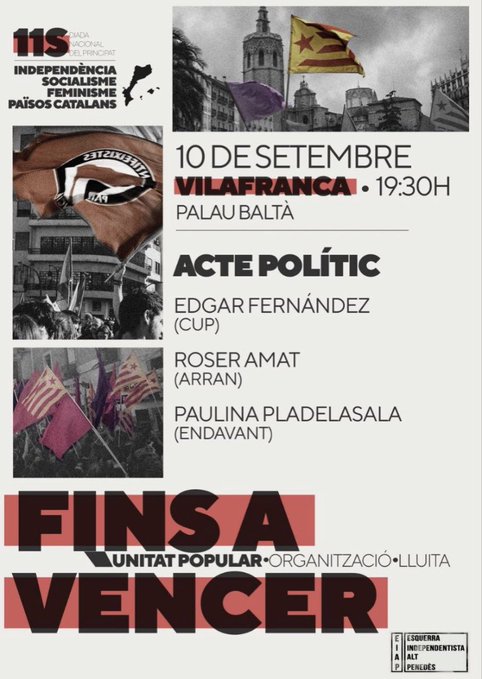 19:30h al Palau Baltà. Amb Edgar Fernàndez (CUP), Roser amat (Arran) i Paulina Pladelsala (Endavant). Organitzat per l’Esquerra Independentista de l’alt Penedès.