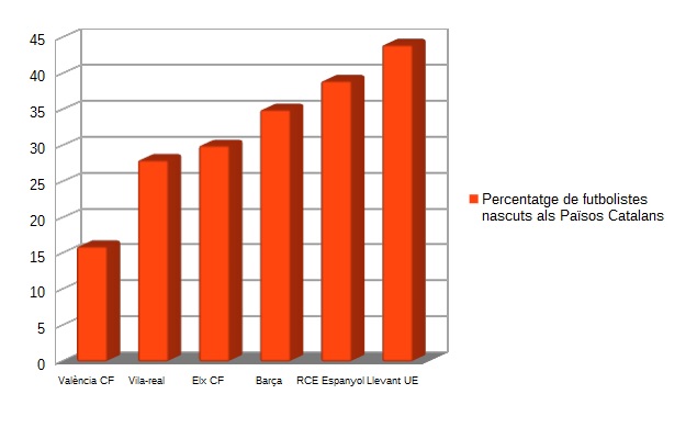 Entre els més habituals cal destacar Casilla, Sergio Garcia i Víctor Sánchez del RCE Espanyol, Busquets i Jordi Alba del Barça, Casadesús del Llevant, Bruno i Mario del Vila-real, Víctor Rodríguez i Coro de l’Elx i Gayà i Paco Alcácer del València Club de Futbol. Cal destacar el mèrit que tenen aquests dos darrers jugadors, perquè el club de Mestalla és el que pitjor tracta els jugadors de la casa. En efecte, després de la recent marxa de Carles Gil a l’Aston Villa, el València només compta amb 4 autòctons, un 16,6% de la plantilla. Els veïns pobres d’Orriols, són l’altra cara de la moneda. Amb 11 futbolistes nascuts als Països Catalans (el 44% del total) són l’equip que més aposta pel producte de la Terra, potser també perquè això sol resultar més econòmic.