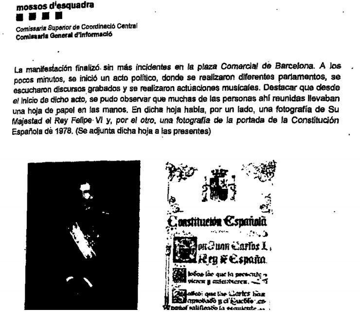 Els informes que la CGINF dels mossos envia a l’Audiència espanyola, el tribunal per a la persecució d’idees espanyol, destaquen pel seu caràcter polític, apuntant a l’esquerra independentista, com en aquest informe sobre la diada de 2016 a Barcelona. Aquells informes acabaren amb la detenció de diversos militants independentistes, que foren citats a l’Audiència espanyola.
