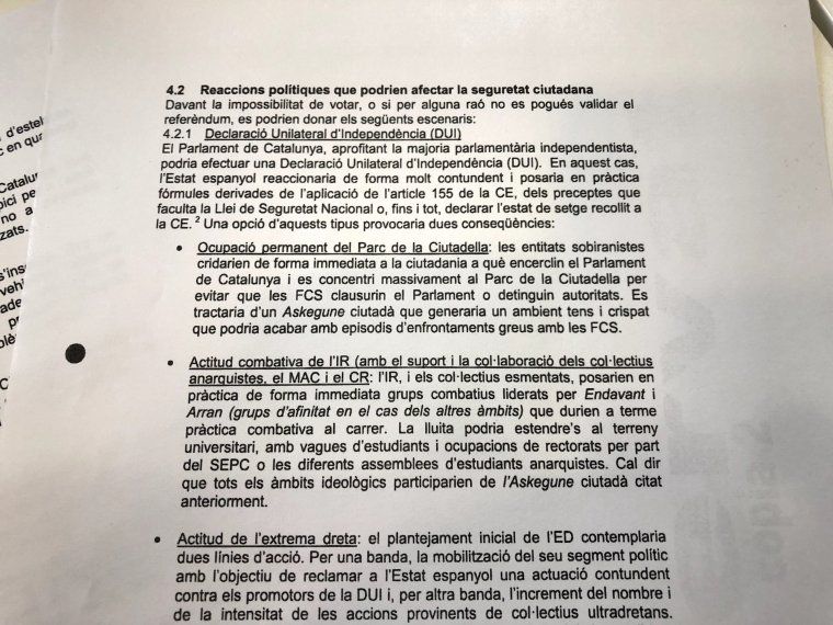 L’afició de la Comissaria General d’Informació a la literatura política dugué poc abans de l’1O, a realitzar un informe, a càrrec de la Unitat Central d’Anàlisi d’Estratègies d’Organitzacions, divisió de la CGINF, on s’anunciava un escenari de violència de l”Independentisme Radical’ (citava les organitzacions de l’esquerra independentista Endavant OSAN, Arran i SEPC) amb ajut d’anarquistes, i uns desconeguts ‘Moviment Antifeixista Català’, i ‘Comunisme Revolucionari’. L’informe es feia pocs dies abans que l’esquerra independentista, amb els CDR, coordinés ocupacions dels col·legis per fer possibles les votacions en bona part del Principat, i intentava inventar escenaris de violència que justifiquessin la marxa enrere del govern amb la DUI.