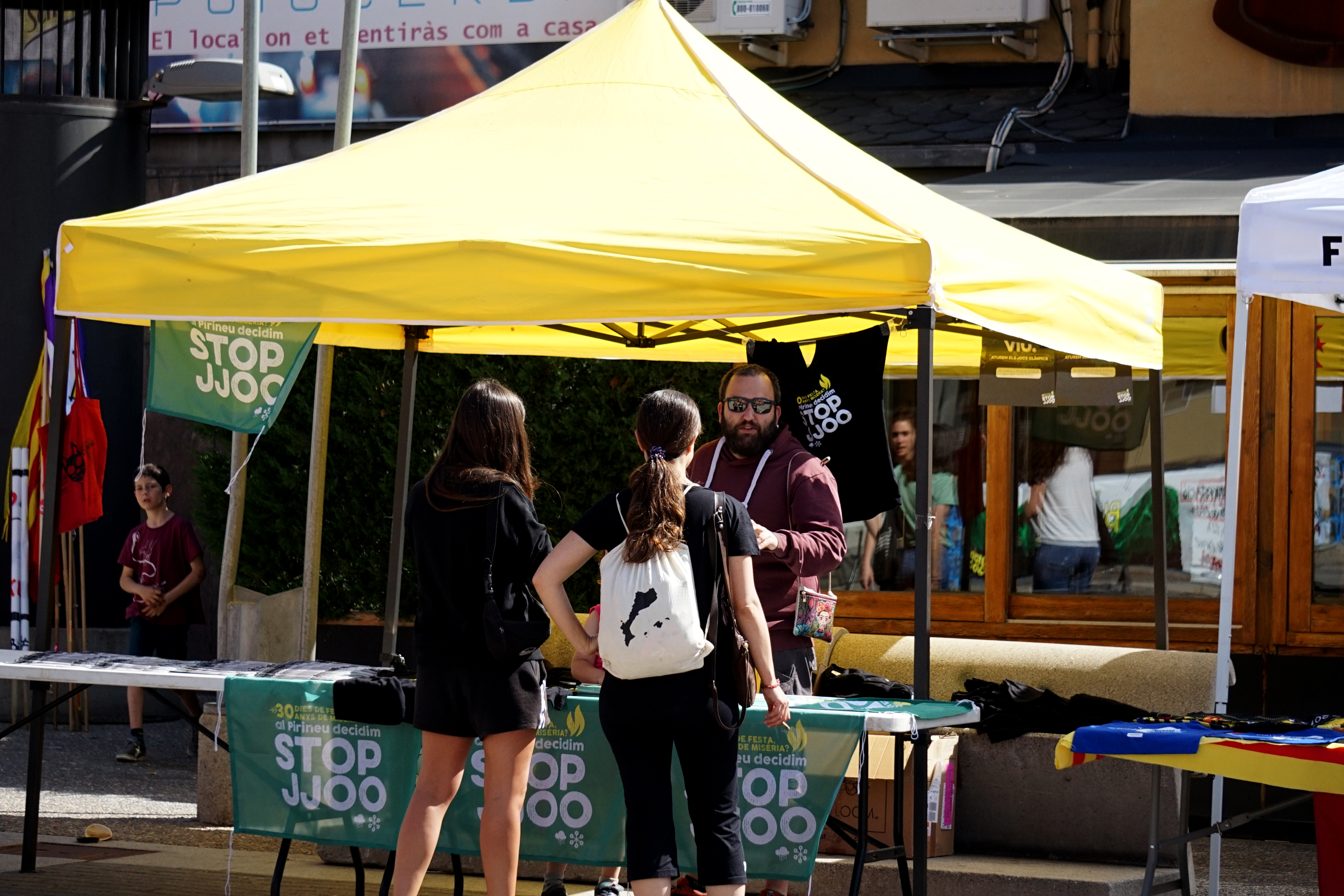 Durant el matí, la venda de domassos i samarretes contra els JJOO és un degoteig