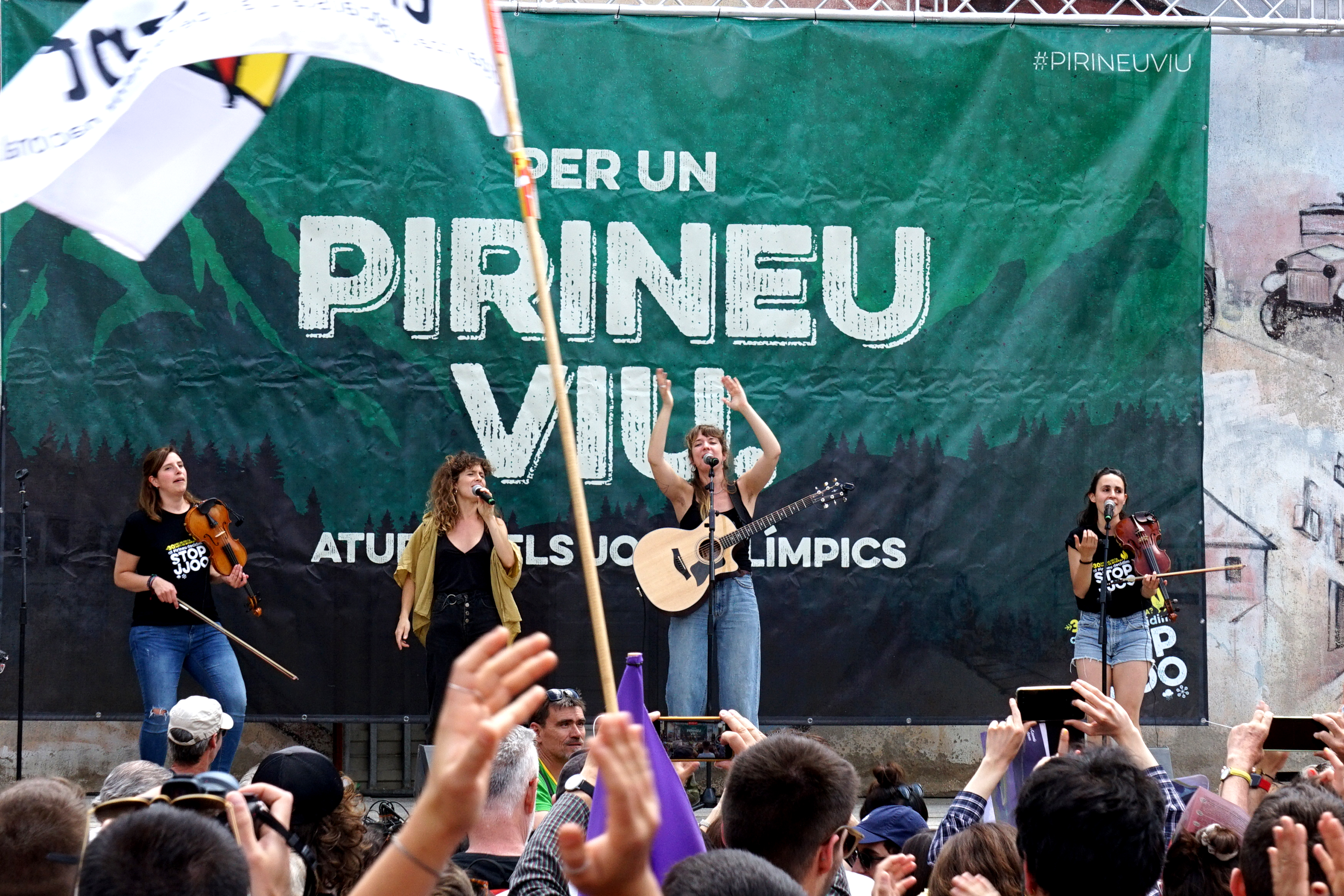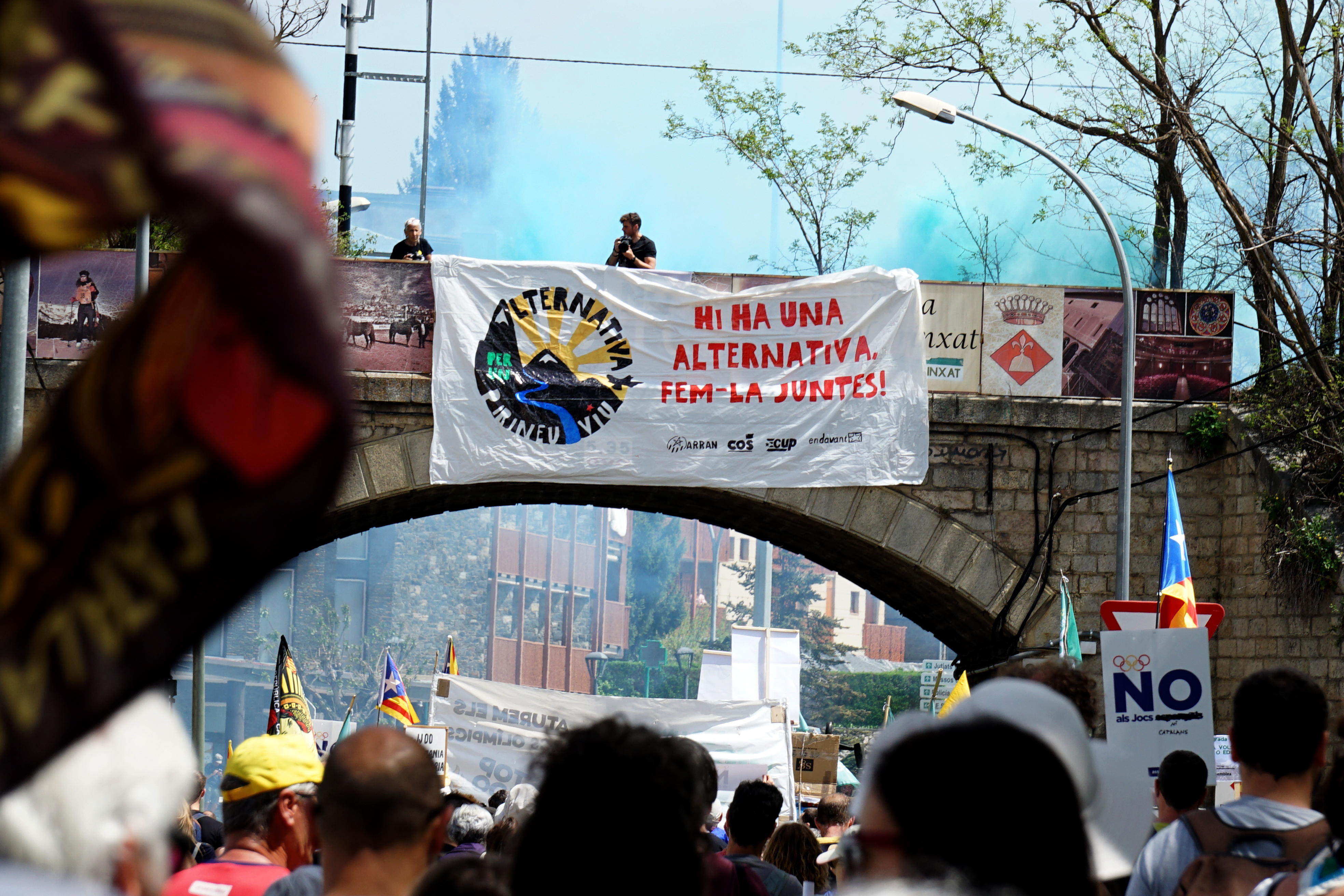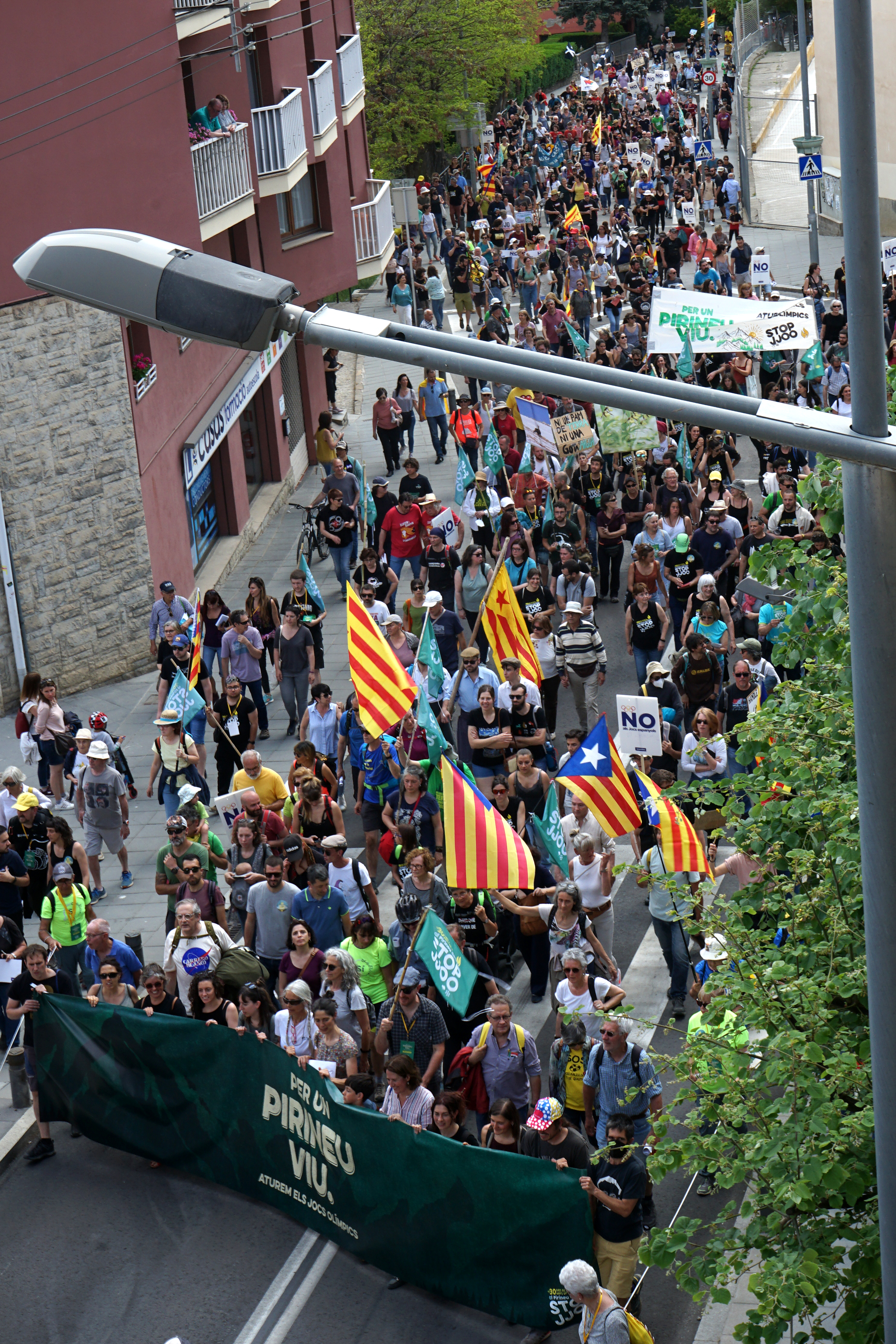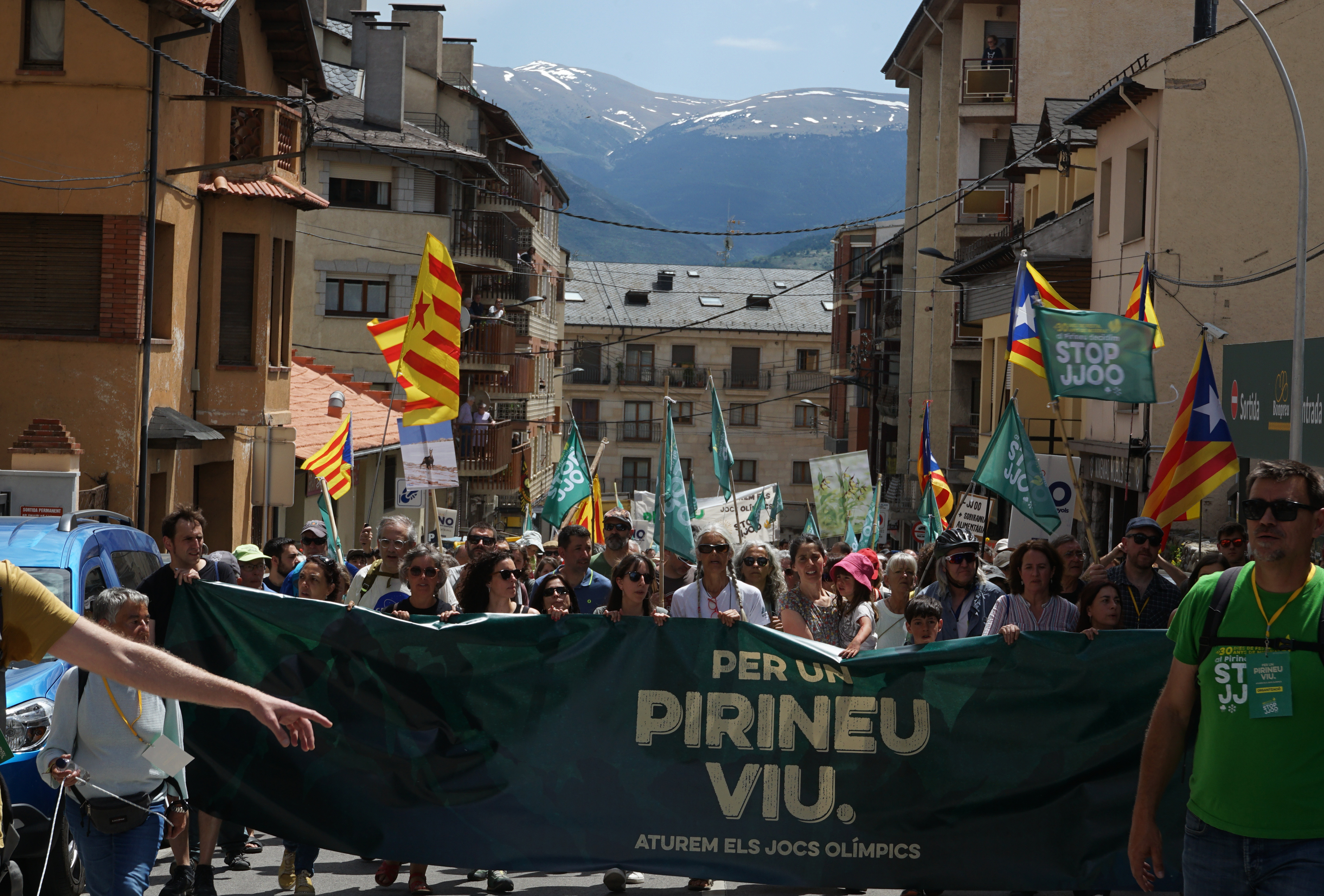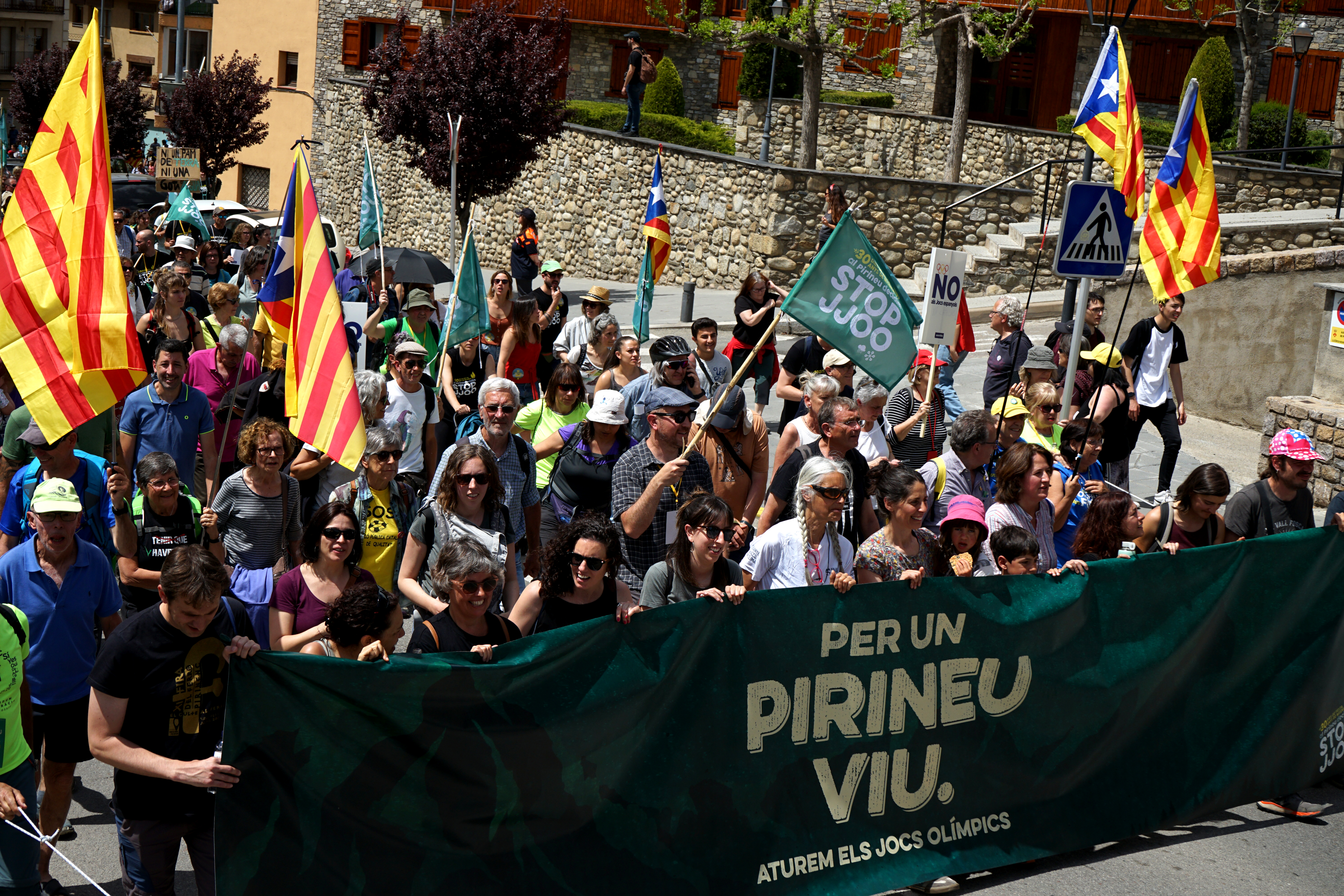 La capçalera acumula domassos, banderes, cartells i una pancarta alçada. Per un Pirineu Viu i contra els Jocs Olímpics