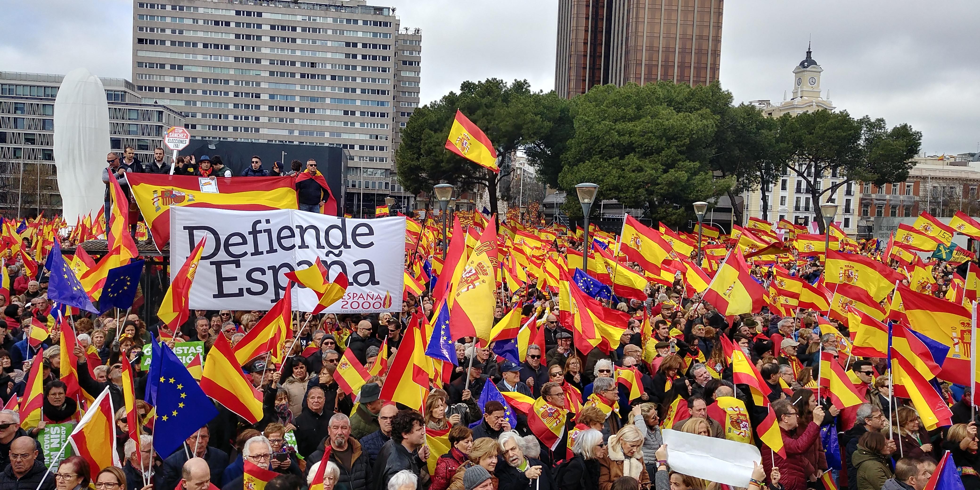 En definitiva, ens trobem davant un viratge etnicista de part del bloc PSOE-Podemos, representant de l’espanyolisme liberal-progressista, que avança a rebuf de les tesis pròpies de l’espanyolisme catòlic-conservador, feixistoide i feixista, segons les quals cal transformar un conflicte que s’havia plantejat en termes nacionals en un conflicte ètnic que pivoti sobretot a l’entorn de la qüestió lingüística. Al final les teories de «resignificació de la bandera [espanyola]» que l’Errejón va importar acríticament de l’Amèrica Llatina —volent-les aplicar a un estat imperialista amb nacions oprimides on el nacionalisme té un bagatge feixista recent— no han servit per crear un «patriotisme progressista», sinó que només han servit per blindar de nou el règim amb una ala esquerra obedient al servei del sistema. És més, l’increment de la retòrica patriòtica i l’agitació de la bandera —cada cop més la monàrquica— de part del PSOE-Podemos no ha fet més que encabritar l’espanyolisme de dreta i el seu sector feixista, en una competència per qui representa millor la «pàtria».
