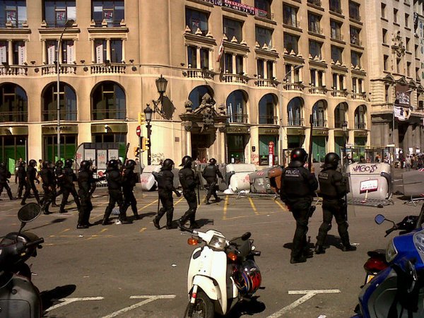 Els Mossos d’Esquadra, a més, han carregat en un primer moment contra la gent que es troba concentrada fora l’edifici per tal de donar suport i ara, al voltant de les 5 de la tarda, estan disparant amb pilotes de goma al Passeig de Gràcia contra tota la gent que s’hi vol apropar.
