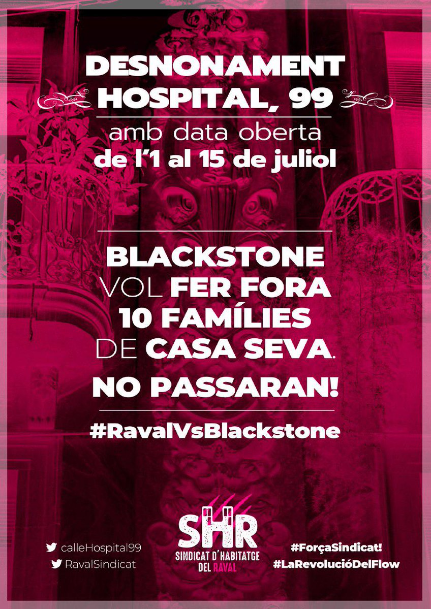 Entre els dies 1 al 15 de Juliol està previst un desnonament amb data oberta dels veïns dels immobles que el fons voltor Blackstone té Carrer Hospital 99 de Barcelona. 10 famílies podrien perdre la seva casa. Des del Sindicat d’Habitatge del Raval s’ha impulsat una àmplia mobilització per impedir els desnonaments.