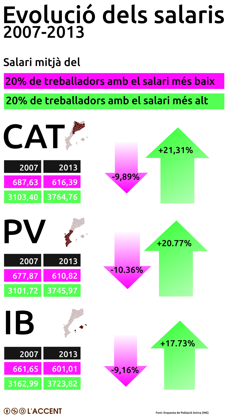 Així, el 20% d’assalariats amb el salari més alt han vist com aquest s’augmentava durant la crisi al voltant del 20% al conjunt dels Països Catalans. Per contra, el 20% d’assalariats amb el salari més baix (molt majoritàriament dones) han vist com durant la crisi el seu ja minvat salari disminuïa un 10%.
