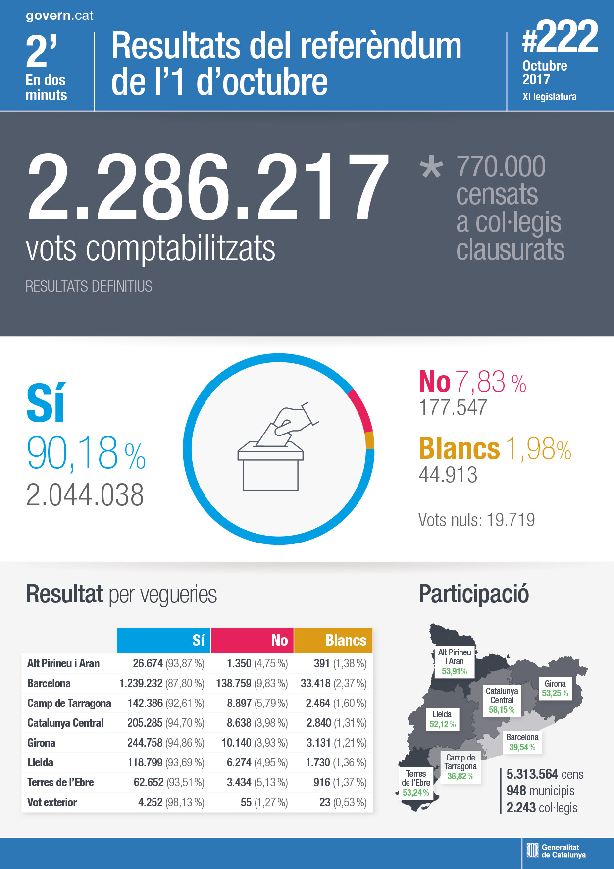 L’1 d’octubre de 2017, i malgrat la violència dels cossos policials espanyols, es féu un referèndum d’autodeterminació al Principat de Catalunya on el Sí a la independència vencé amb el 90,18% dels vots