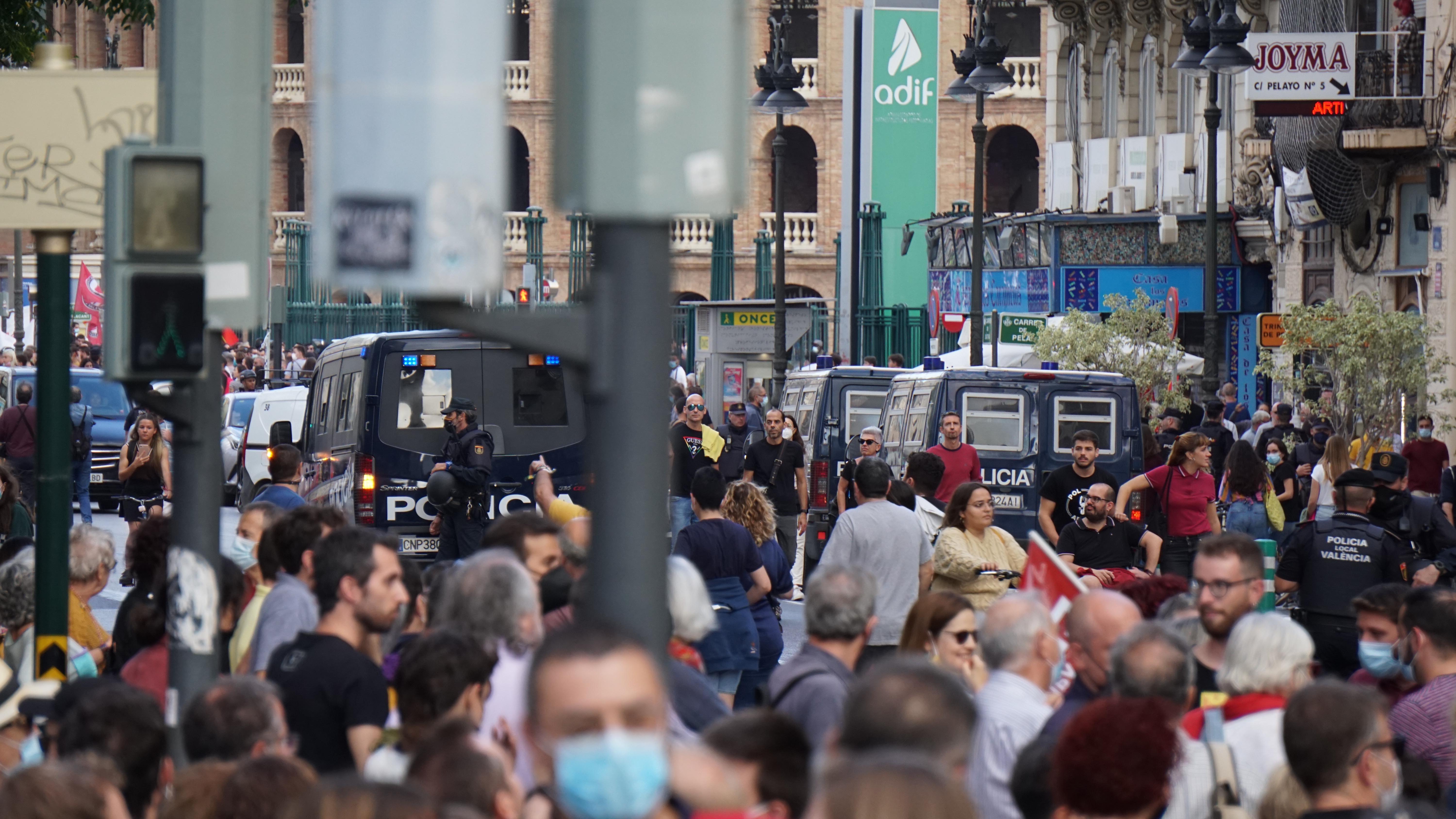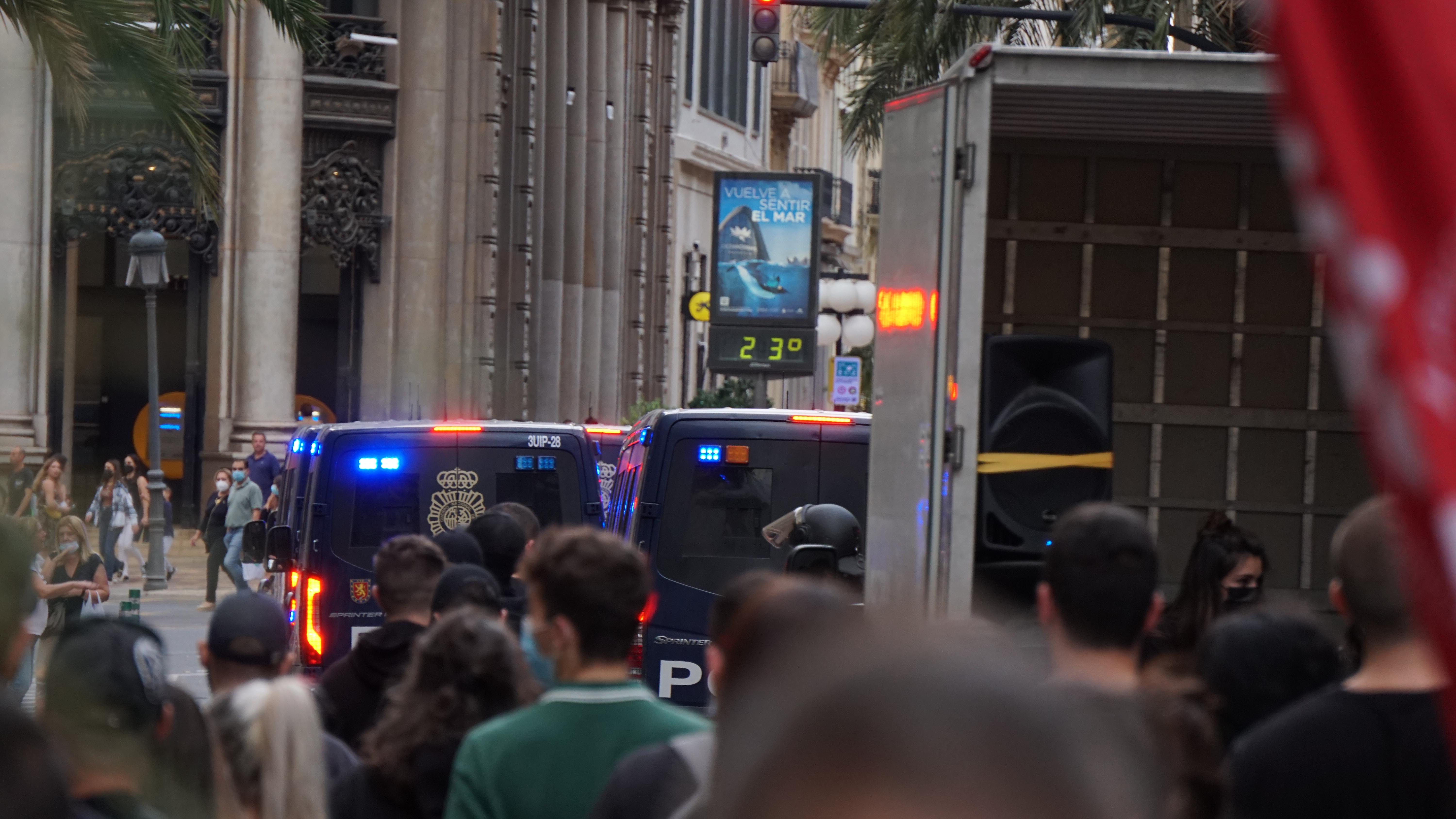 10. Davant, darrere i a cada lateral, furgons i policies a peu fan un seguiment a tocar de la manifestació.