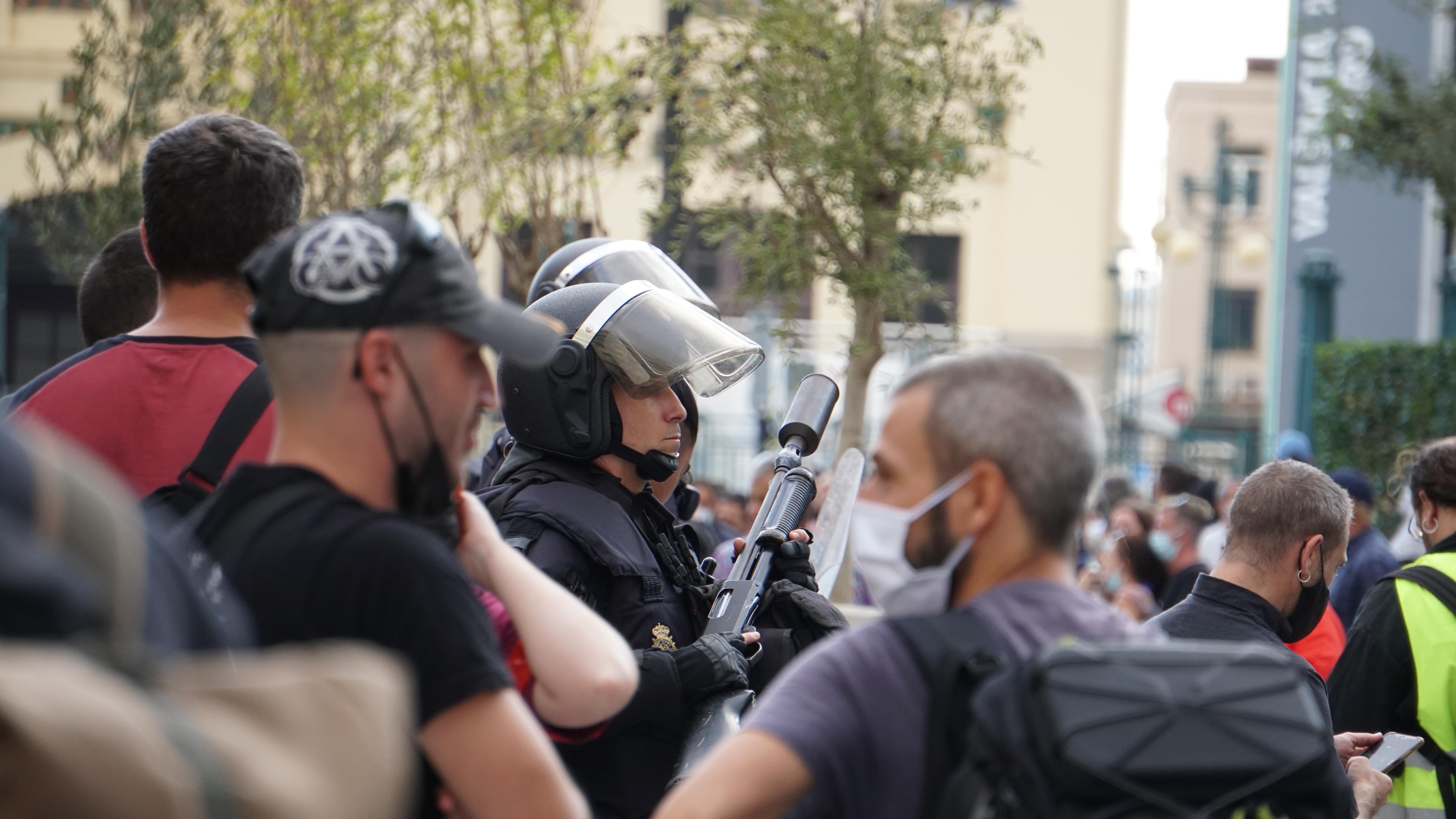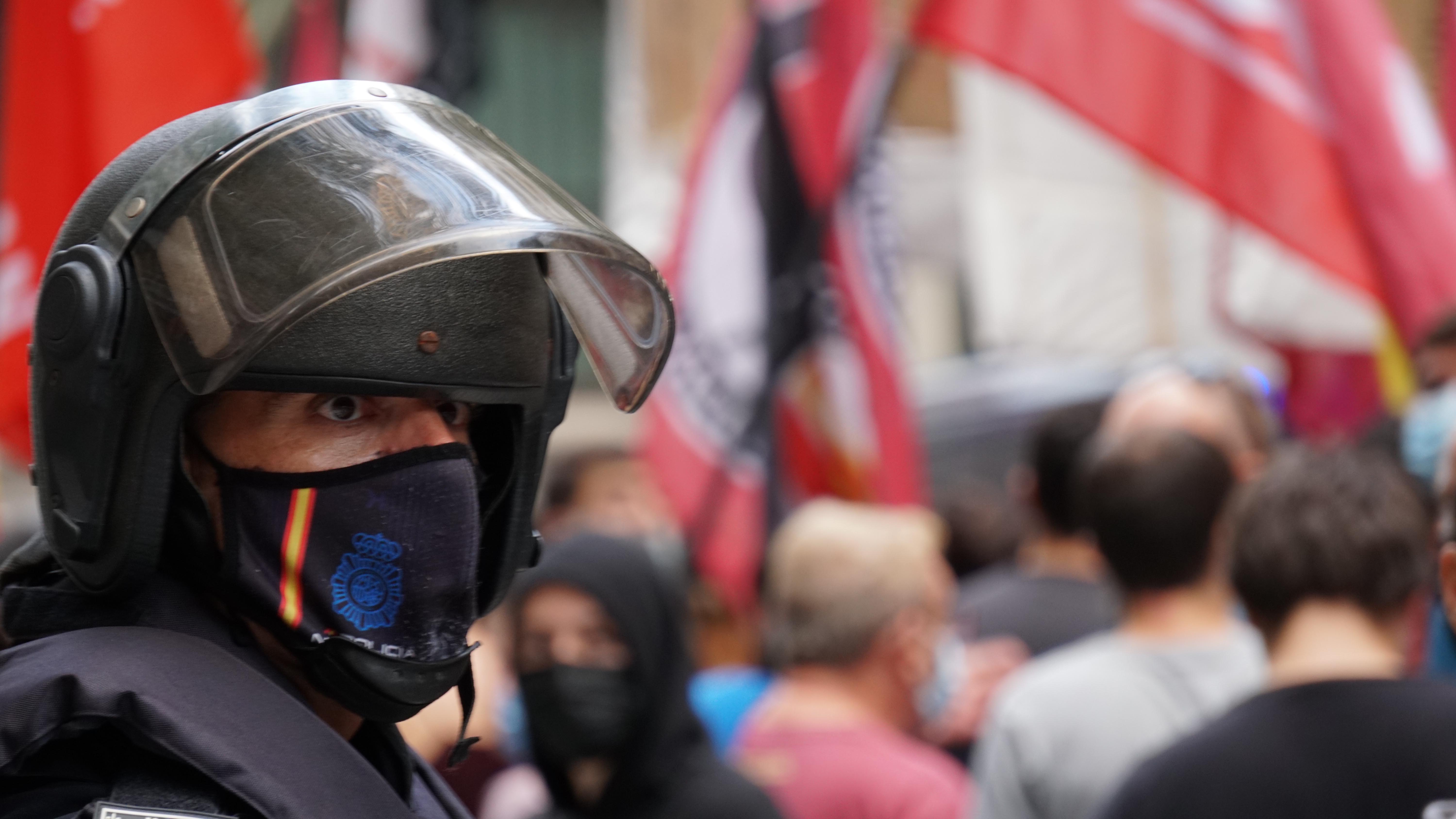 11. Un encaputxat de la policia espanyola vigila els manifestants.