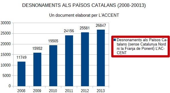 En efecte, l’informe “Efectos de la crisis económica en los órganos judiciales”, publicat pel Consejo Superior del Poder Judicial (el govern dels jutges) és demolidor, especialment pel que fa als Països Catalans sota domini espanyol. Amb les dades a la mà ja podem assegurar que, a casa nostra, el 2014 marcarà un nou rècord de desnonaments. Així, si el 2013 el Principat de Catalunya, el País Valencià i les Illes Balears, van sumar el que seria el màxim històric des de l’inici de la crisi, 26.847; enguany els òrgans oficials ja en compten 23.794.