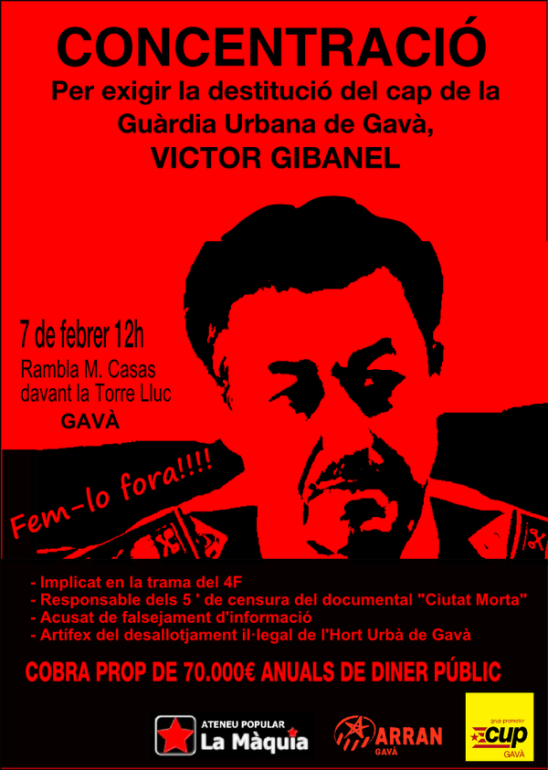“Nosaltres desconeixíem el passat de Víctor Gibanel abans de veure el documental ‘Ciutat Morta’”, explica Jordi Casanova, militant d’Endavant i membre de l’Ateneu Popular La Màquia, un dels organitzadors de la concentració que aquest dissabte demanarà la destitució de Gibanel com a cap de la Guàrdia Urbana de Gavà. La mobilització tindrà lloc a les 12 del migdia a la Rambla Maria Cases de Gavà i té com a objectiu assenyalar el passat fosc de Gibanel com a cap d’informació de la Guàrdia Urbana de Barcelona: “està implicat en abusos d’aquell cos policial, i també en l’encobriment de tortures”, assenyala Casanova. Segons els convocants de la concentració,un altre motiu per destituir Gibanel és la seva “actitud fosca” al capdavant de la policia municipal de Gavà, així com per haver estat posat a dit per l’anterior alcalde Joaquim Balsera, del PSC. Actualment, Gibanel cobra 70.000 euros de sou anual pel càrrec públic que desenvolupa.