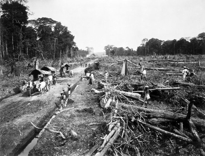 La història colonial es va caracteritzar per l’ecocidi massiu i l’extracció de recursos. Des de la península de Malaia fins a les Índies Orientals Holandeses, es van talar boscos per construir el transport marítim colonial i fer espai per als camps de treball de les plantacions, on la població local va ser esclavitzada en condicions bàrbares. Tal com va documentar Mike Davis al seu llibre, Late Victorian Holocausts, l’expansió dels sistemes de plantació orientats a l’exportació va provocar fams massives al Sud global que van causar desenes de milions de morts en el cim de l’era imperial. Simultàniament, es van robar bilions de dòlars del món colonitzat, des de l’Índia ocupada pels britànics fins a les Índies Orientals Holandeses, omplint directament les arques dels governs i corporacions del nord. Les antigues potències colonials tenen clarament la responsabilitat principal de qualsevol dany ecològic incorregut per aquest sistema.