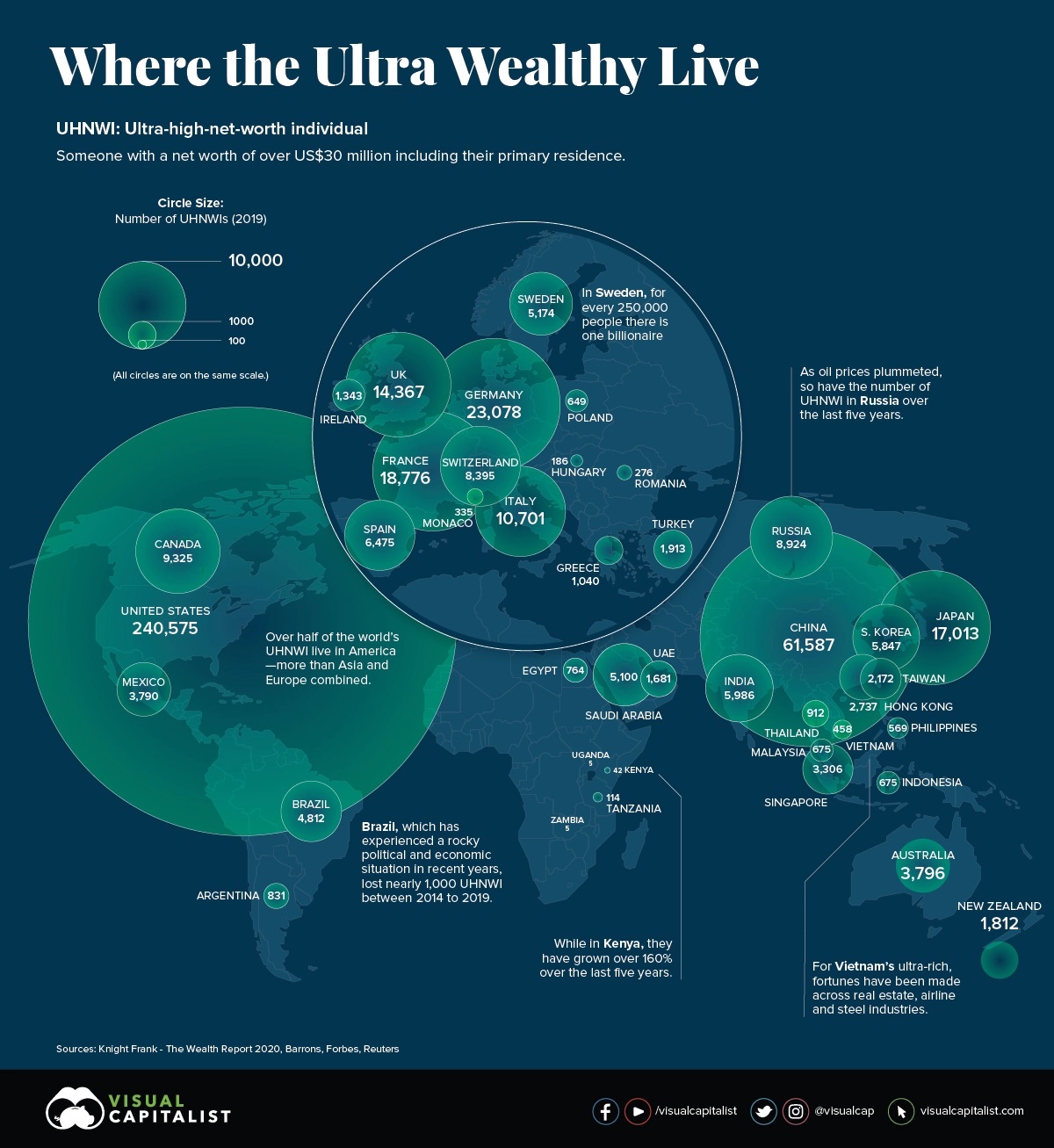 Només un 15 per cent dels ultra-rics UHNWI viuen en països que es podrien considerar com a competidors geopolítics, principalment l’Organització del Tractat de Seguretat Col·lectiva i la Xina. Irònicament, aquests “oligarques” russos i xinesos tenen molt menys poder polític que els anomenats empresaris i filantrops del món occidental, ja que són empresonats i fins i tot assassinats regularment. El més notori és que l’oligarca rus Mikhaïl Khodorkovsky, que fou una vegada l’home més ric de Rússia, va ser empresonat durant deu anys i la seva corporació Yukos, amb reserves de petroli de la mida de l’Iraq, va ser totalment nacionalitzada.