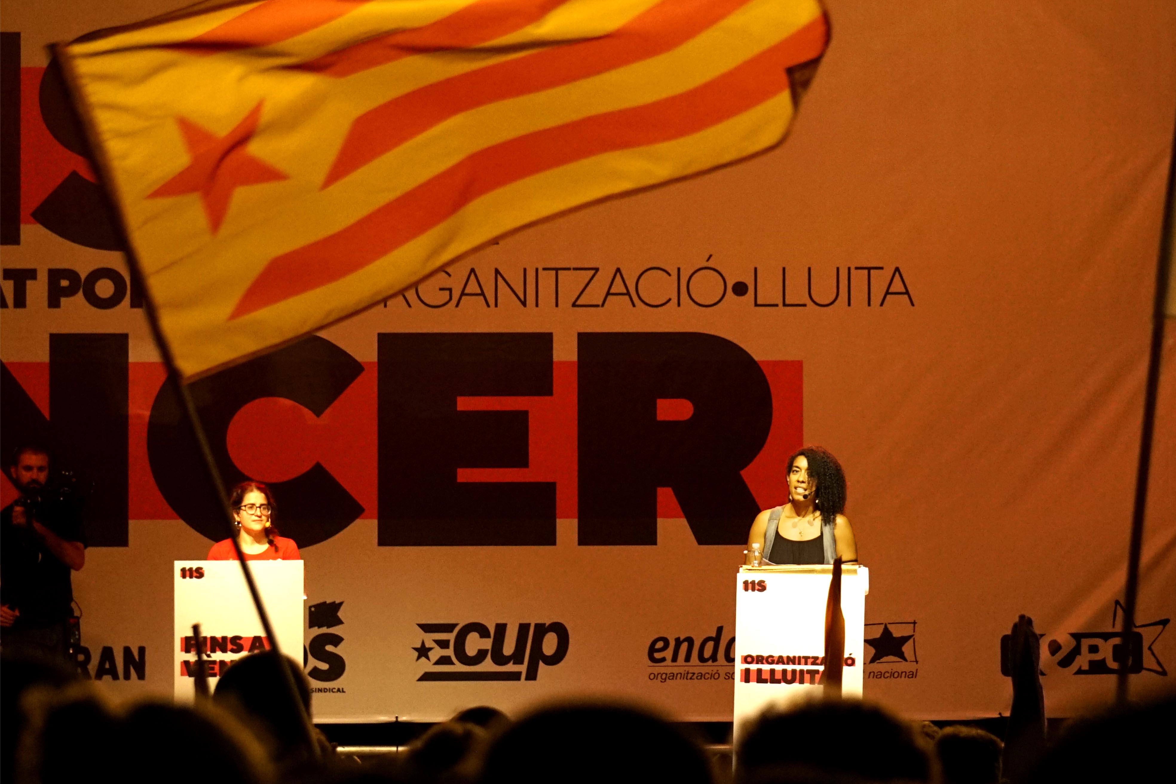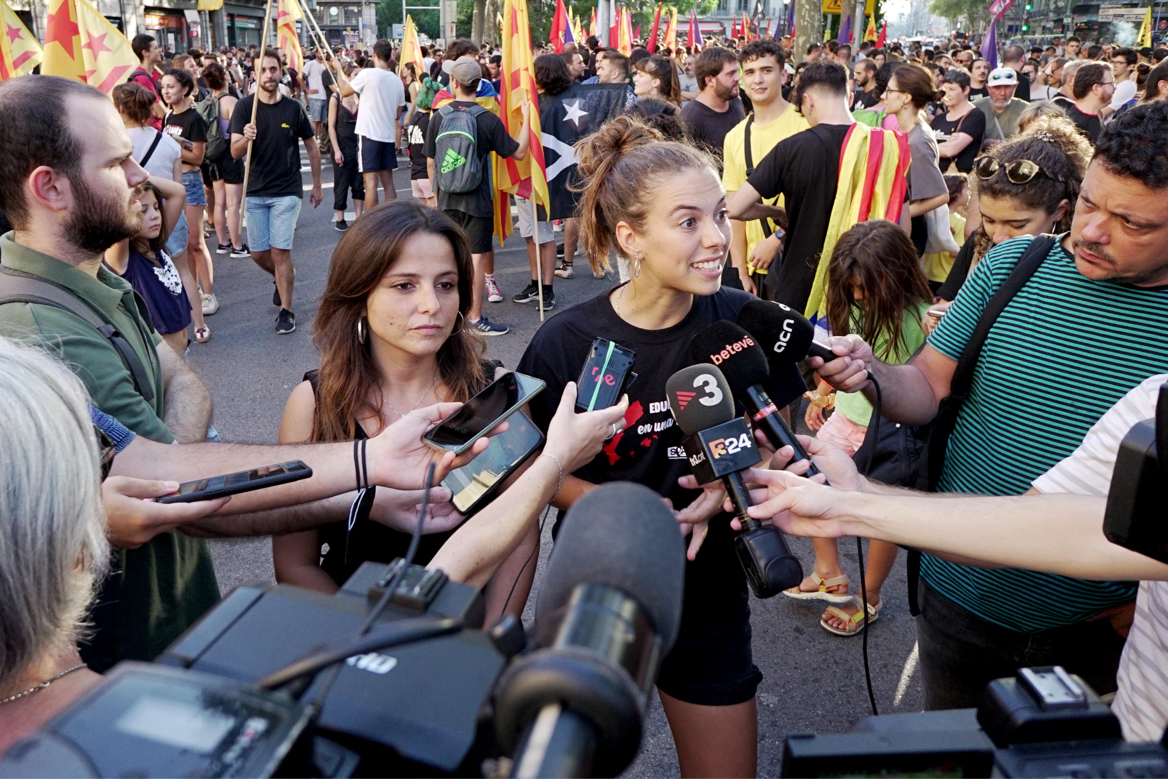 Quarts de set de la tarda i Marta Daviu, portaveu del SEPC, i la cupaire Maria Sirvent atenen a la premsa abans de començar la manifestació històrica de l’independentisme