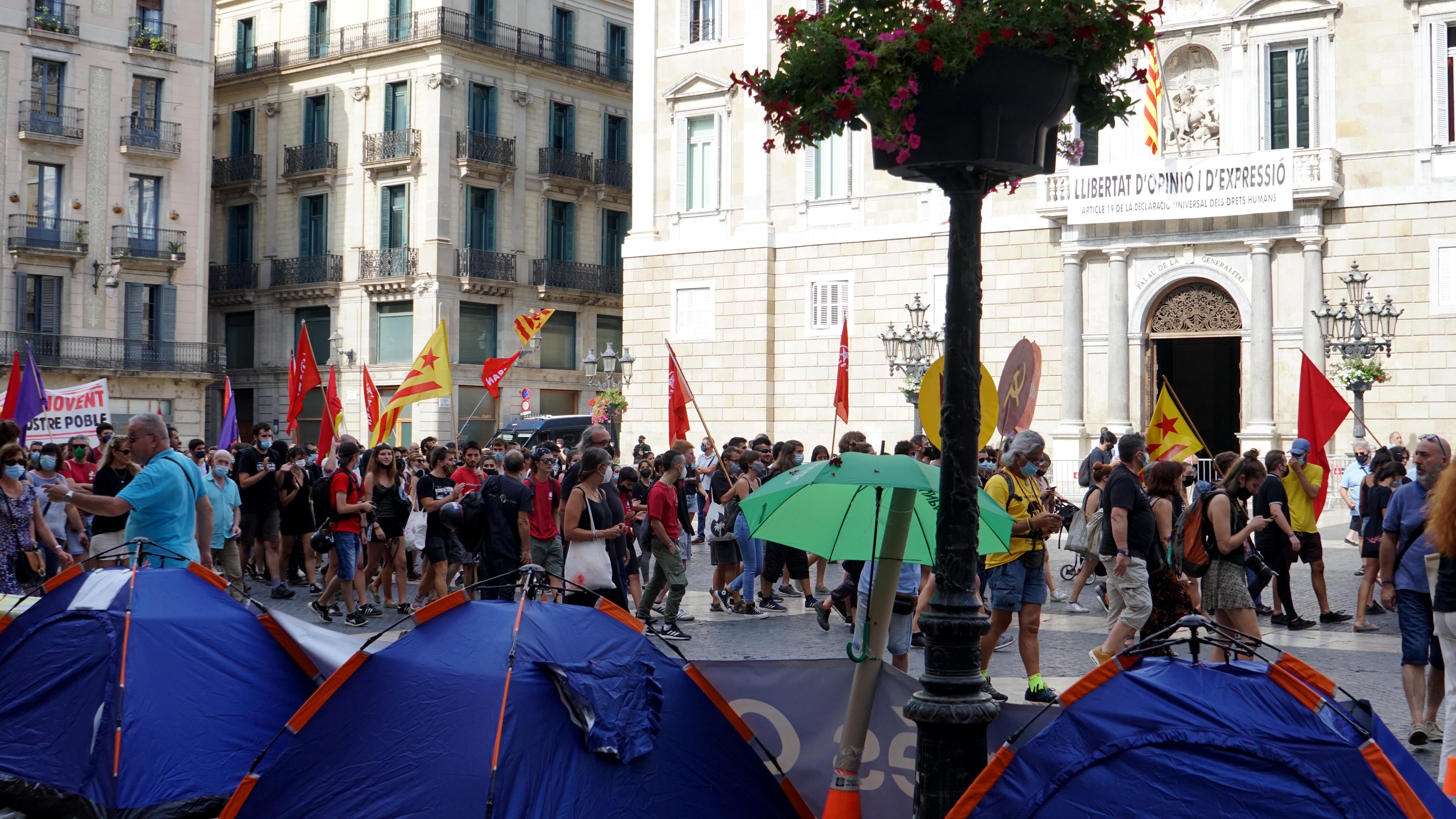 <dd class="wp-caption-text gallery-caption" id="gallery-40-26137"> La manifestació creua la plaça Sant Jaume on acampa Zeroport contra l’ampliació de port i aeroport. </dd>